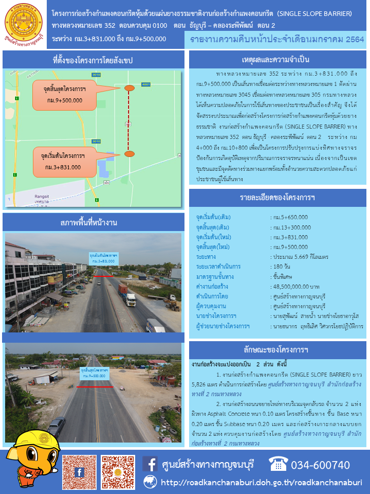 | ความคืบหน้าโครงการก่อสร้างกำแพงคอนกรีตหุ้มด้วยแผ่นยางธรรมชาติงานก่อสร้างกำแพงคอนกรีต (SINGLE SLOPE BARRIER) ทางหลวงหมายเลข 352 ตอนควบคุม 0100 ตอน ธัญบุรี – คลองระพีพัฒน์ ตอน 2 ระหว่าง กม.3+831.000 ถึง กม.9+500.000 ในปีงบประมาณ 2564 ประจำเดือนมกราคม 2564 นายช่างโครงการ นายสุพัฒน์ สายน้ำ นายช่างโยธาอาวุโส | 128 | ดาวน์โหลด |