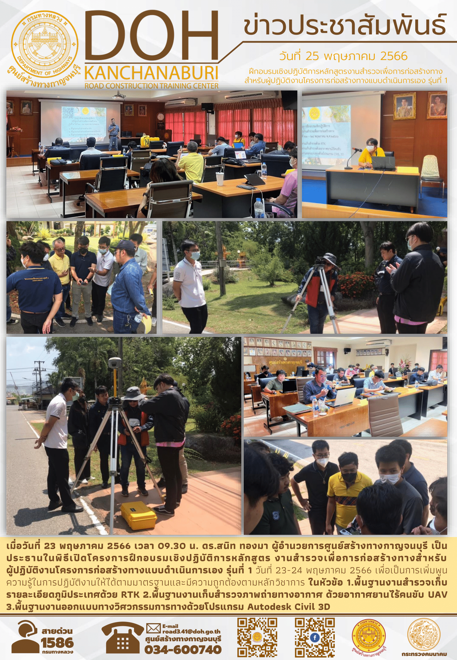 เมื่อวันที่ 23 พฤษภาคม 2566 เวลา 09.30 น. ดร.สนิท ทองมา ผู้อำนวยการศูนย์สร้างทางกาญจนบุรี เป็นประธานในพิธีเปิดโครงการฝึกอบรมเชิงปฏิบัติการหลักสูตร งานสำรวจเพื่อการก่อสร้างทางสำหรับผู้ปฏิบัติงานโครงการก่อสร้างทางแบบดำเนินการเอง รุ่นที่ 1 วันที่ 23-24 พฤษภาคม 2566