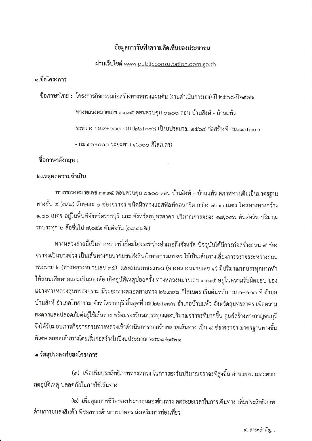 | ข้อมูลการรับฟังความคิดเห็นของประชาชน ผ่าน "www.publicconsultation.opm.go.th โครงการกิจกรรมก่อสร้างทางหลวงแผ่นดิน (งานดำเนินการเอง) ปี ๒๕๖๘ ทางหลวงหมายเลข ๓๓๓๕ ตอนควบคุม ๐๑๐๐ ตอน บ้านสิงห์ - บ้านแพ้ว ระหว่าง กม.๑๓+๐๐๐-กม.๑๗+๐๐๐ ระยะทาง ๔.๐๐๐ กิโลเมตร | 48 | ดาวน์โหลด |