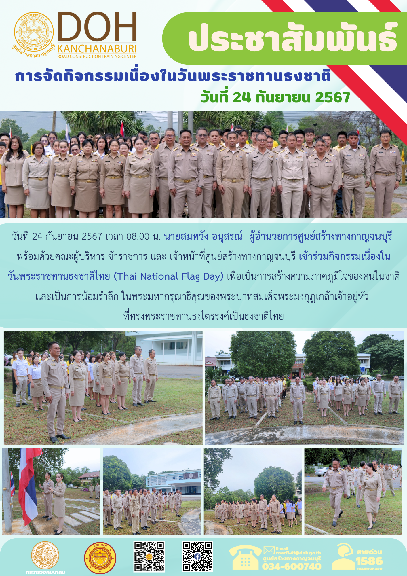 วันที่ 24 กันยายน 2567 เวลา 08.00 น. นายสมหวัง อนุสรณ์ ผู้อำนวยการศูนย์สร้างทางกาญจนบุรี พร้อมด้วยคณะผู้บริหาร ข้าราชการ และ เจ้าหน้าที่ศูนย์สร้างทางกาญจนบุรี เข้าร่วมกิจกรรมเนื่องในวันพระราชทานธงชาติไทย (Thai National Flag Day) เพื่อเป็นการสร้างความภาคภูมิใจของคนในชาติ และเป็นการน้อมรำลึกในพระมหากรุณาธิคุณของพระบาทสมเด็จพระมงกุฎเกล้าเจ้าอยู่หัว ที่ทรงพระราชทานธงไตรรงค์เป็นธงชาติไทย
