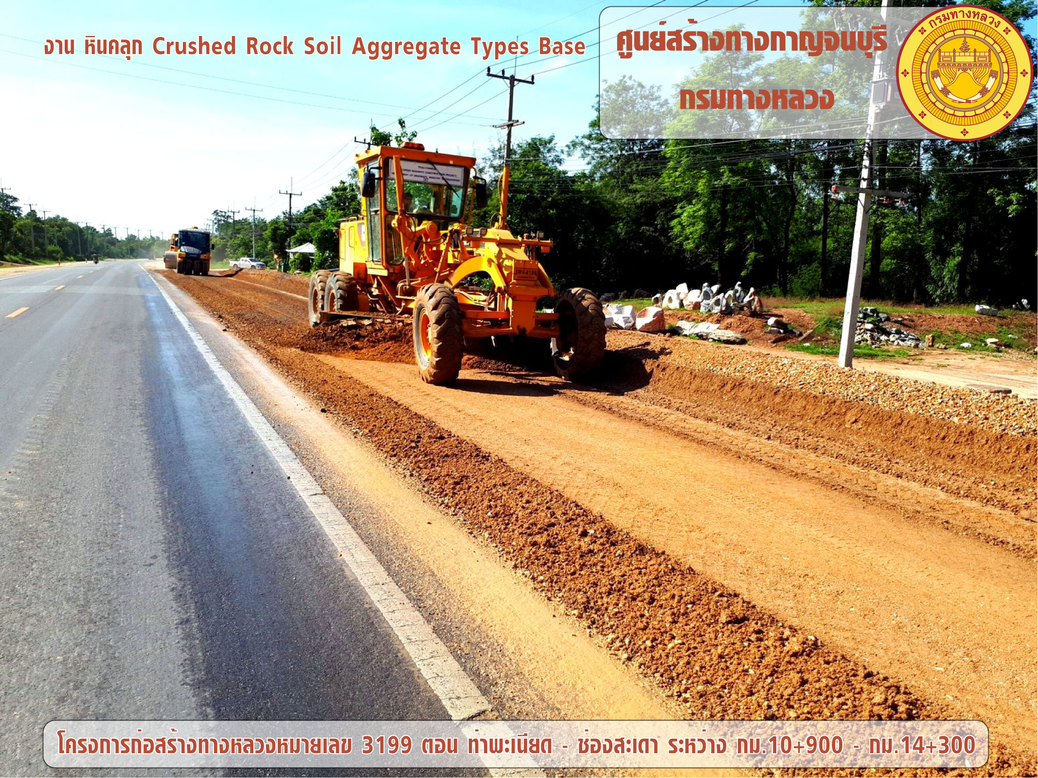 โครงการก่อสร้างทางหลวงหมายเลข 3199 ตอน ท่าพะเนียด - ช่องสะเดา ระหว่าง กม.10+900 - กม.14+300 ได้ดำเนินการก่อสร้างงานหินคลุก (Crushed Rock Soil Aggregate Types Base)