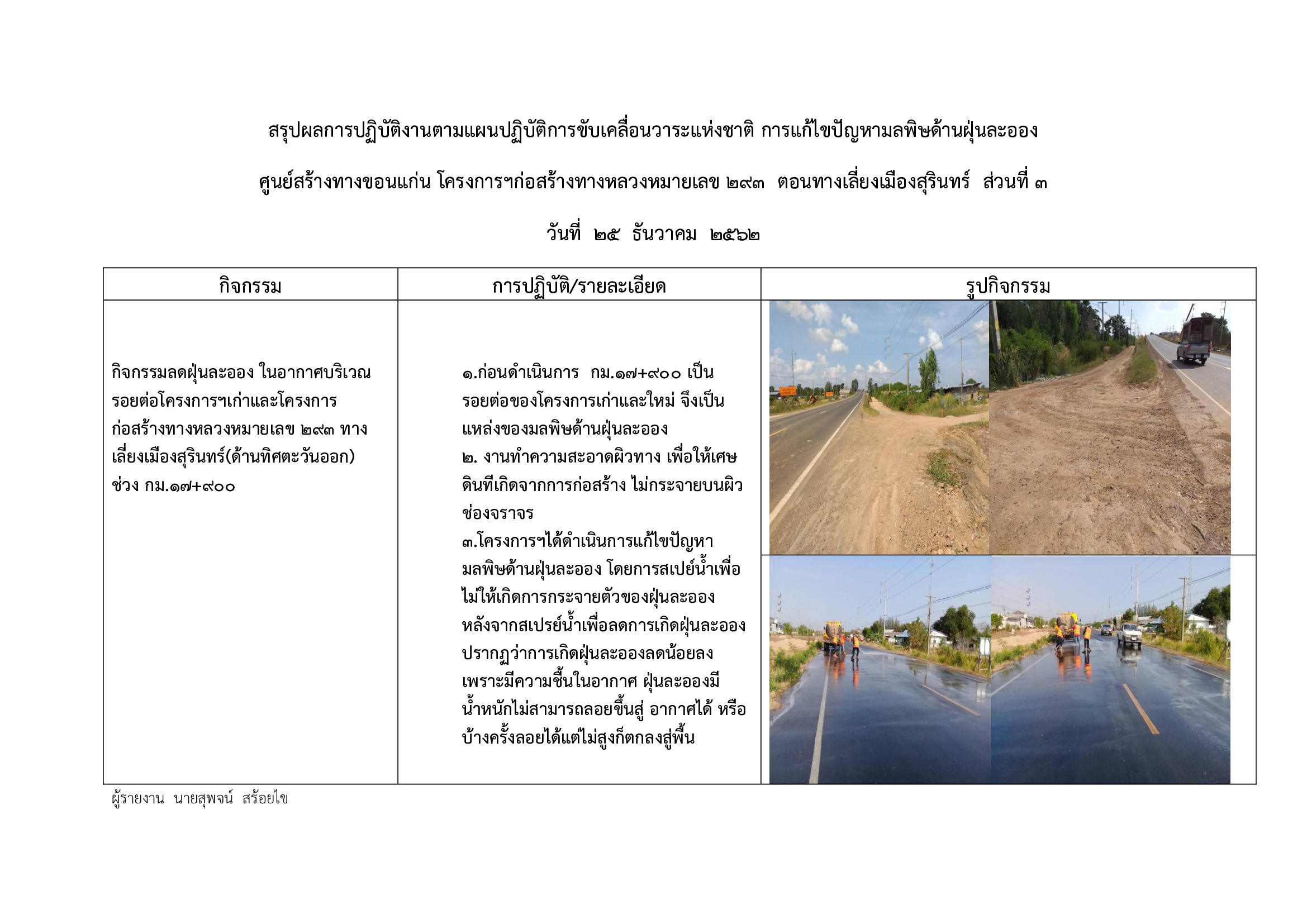 สรุปผลการปฏิบัติงานตามแผนปฏิบัติการขับเคลื่อนวาระแห่งชาติ การแก้ไขปัญหามลพิษด้านฝุ่นละออง ศูนย์สร้างทางขอนแก่น โครงการฯก่อสร้างทางหลวงหมายเลข 293 ตอนทางเลี่ยงเมืองสุรินทร์ ส่วนที่ 3