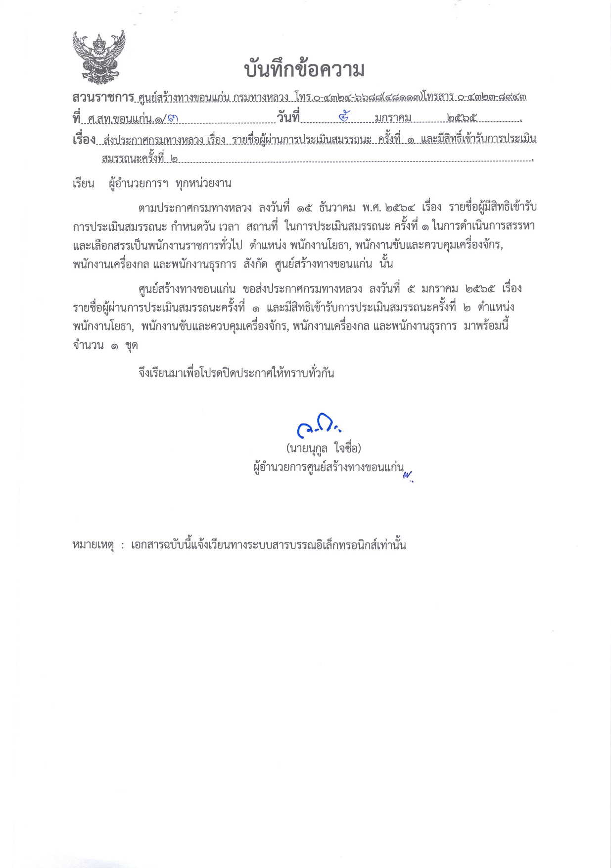 ประกาศรายชื่อผู้ผ่านการประเมินสมรรถนะ ครั้งที่ ๑ และ มีสิทธิเข้ารับการประเมินความรู้ความสามารถ ทักษะ สมรรถนะ ครั้งที่ ๒