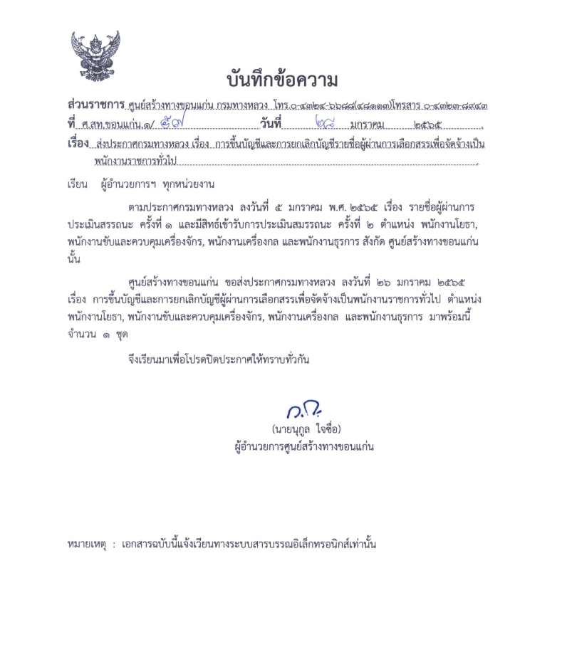 ประกาศกรมทางหลวง เรื่อง การขึ้นบัญชีและการยกเลิกบัญชีรายชื่อผู้ผ่านการเลือกสรรเพื่อจัดจ้างเป็นพนักงานราชการ
