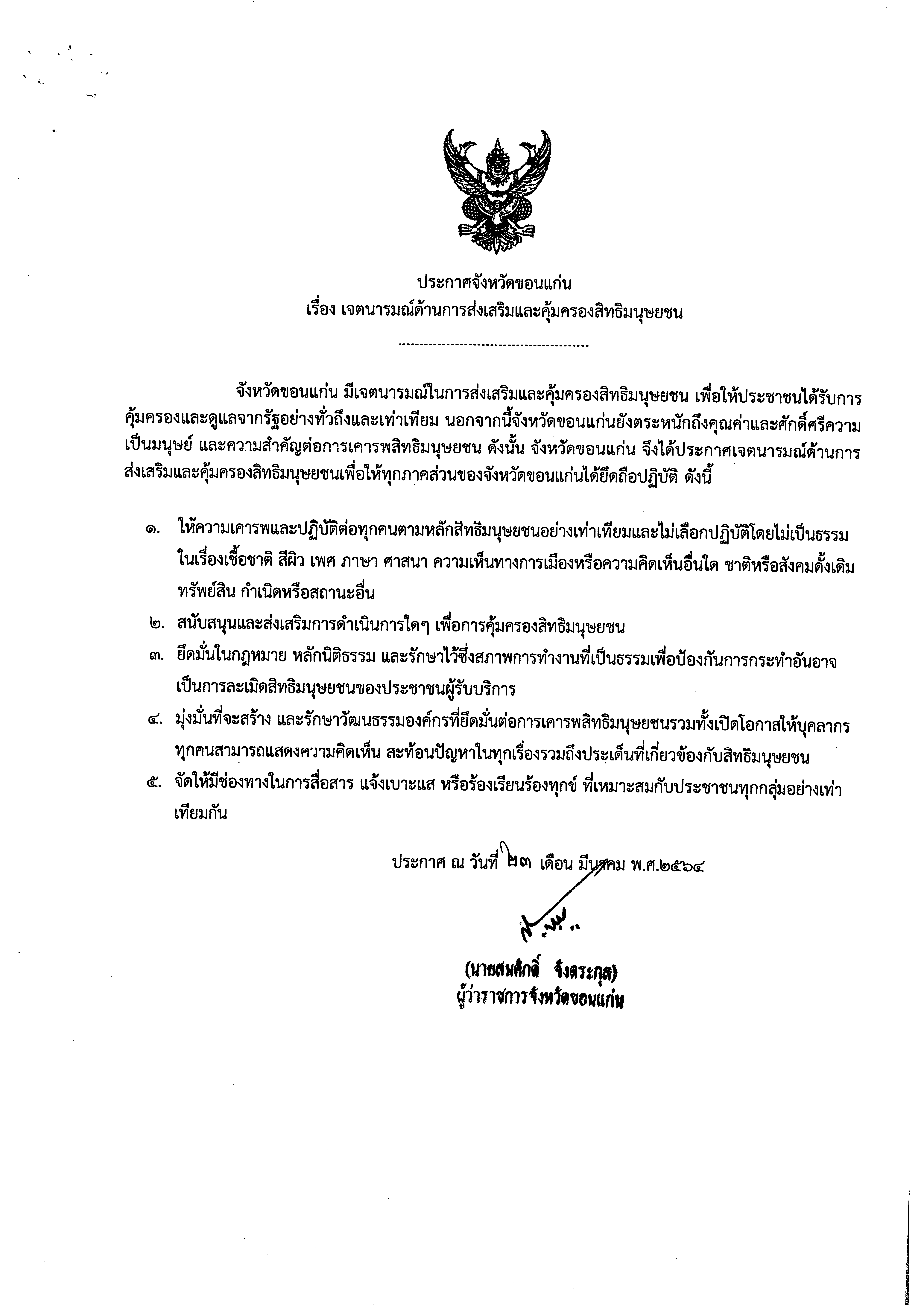 ประกาศจังหวัดขอนแก่น เรื่อง เจตนารมณ์ด้านการส่งเสริมและคุ้มครองสิทธิมนุษยชน