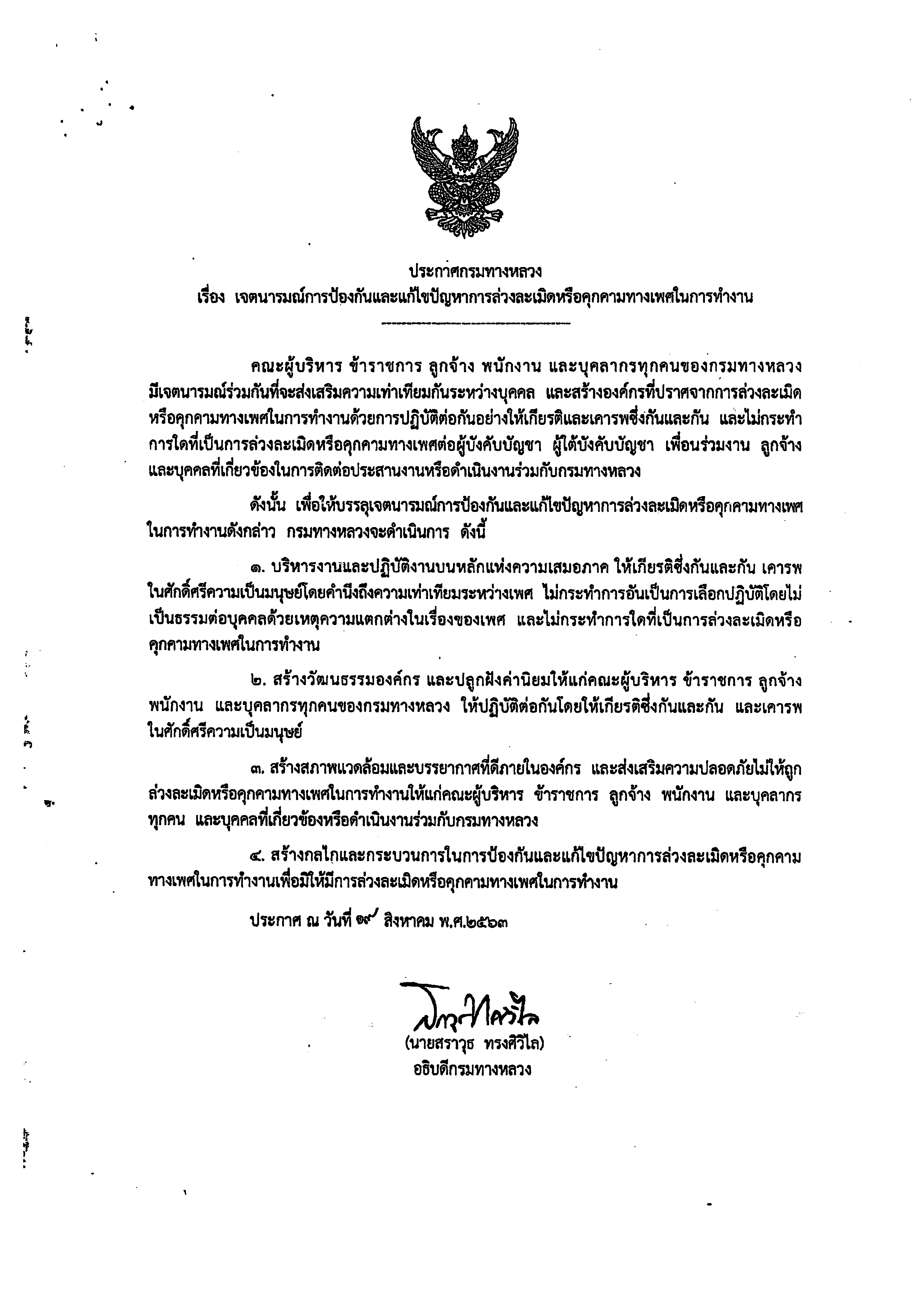 ประกาศ เรื่อง เจตนารมณ์ป้องกันและแก้ปัญหาการล่วงละเมิดหรือคุกคามทางเพศในการทำงาน