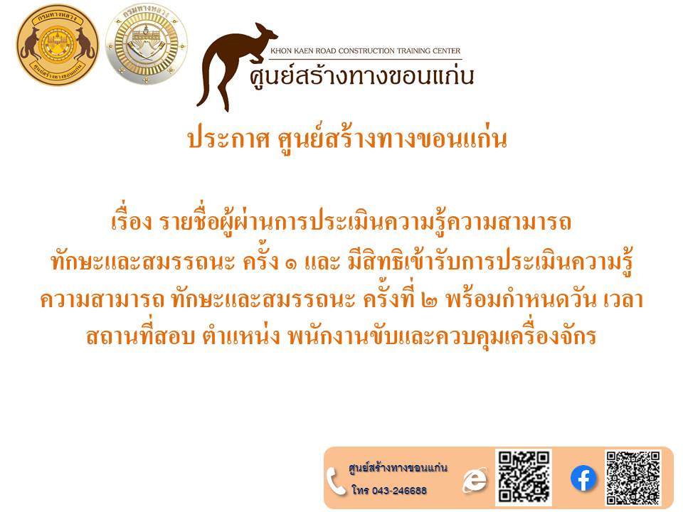 ประกาศลงวันที่ ๒๕ ธันวาคม ๒๕๖๗ เรื่อง รายชื่อผู้ผ่านการประเมินความรู้ความสามารถ ทักษะ และสมรรถนะ ครั้งที่ ๑ และ มีสิทธิเข้ารับการประเมินความรู้ความสามารถ ทักษะและสมรรถนะ ครั้งที่ ๒ พร้อมกำหนดวัน เวลา สถานที่สอบ ในตำแหน่ง พนักงานขับและควบคุมเครื่องจักร