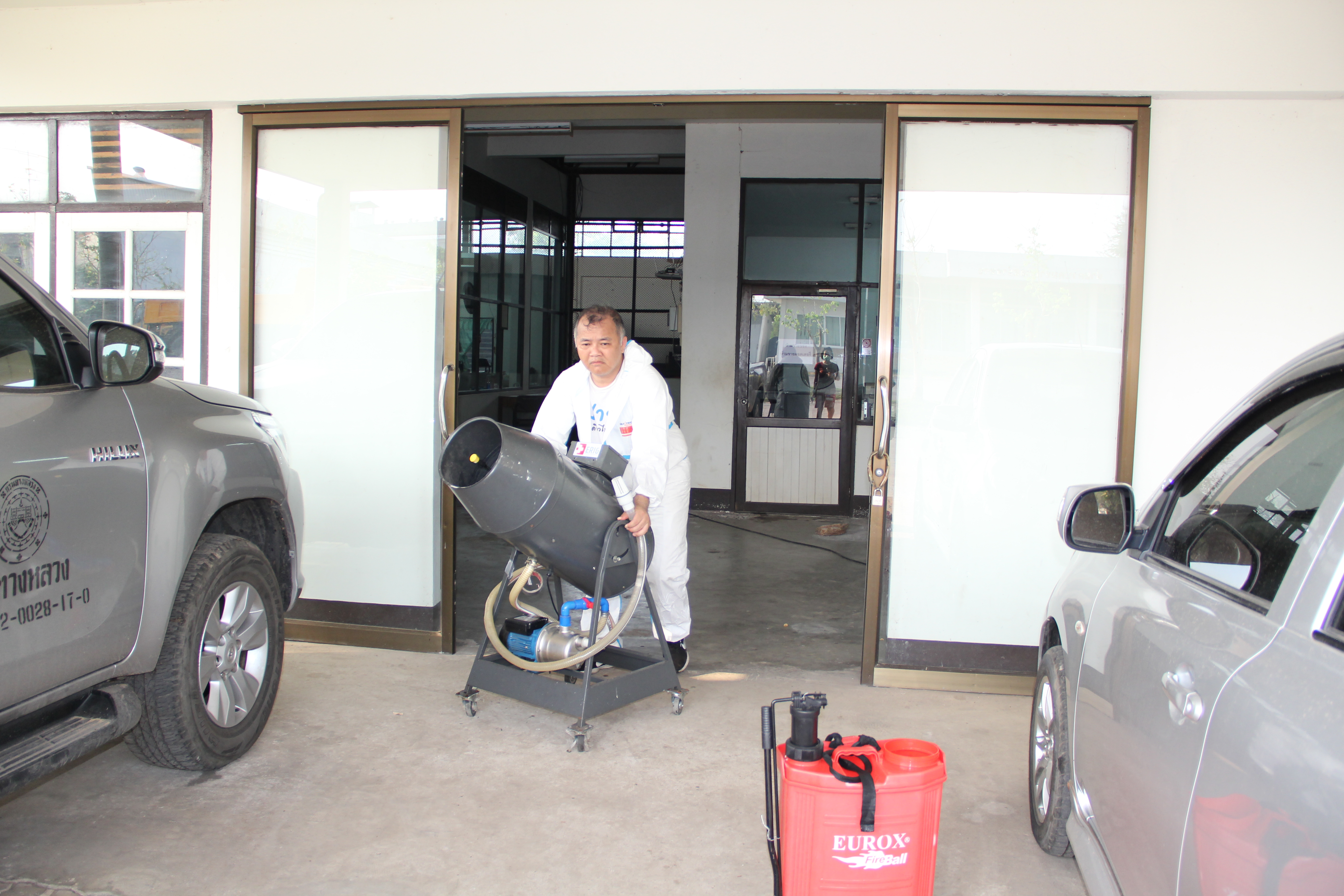 โดยใช้เครื่องพ่นยาความดันสูง บริเวณภายในศูนย์สร้างทางขอนแก่นและอาคารสำนักงานทั้งหมดเพื่อป้องกันการแพร่ระบาดของเชื้อไวรัส COVID - 19