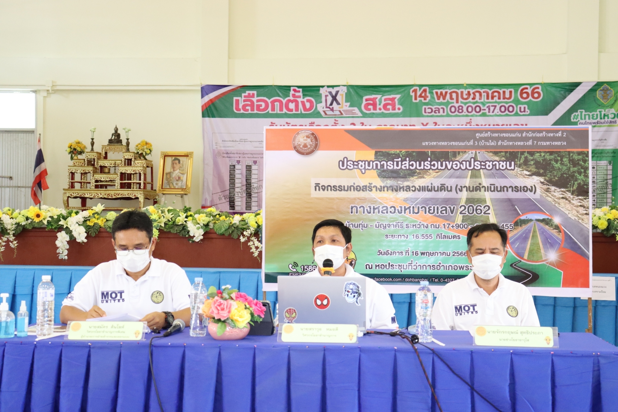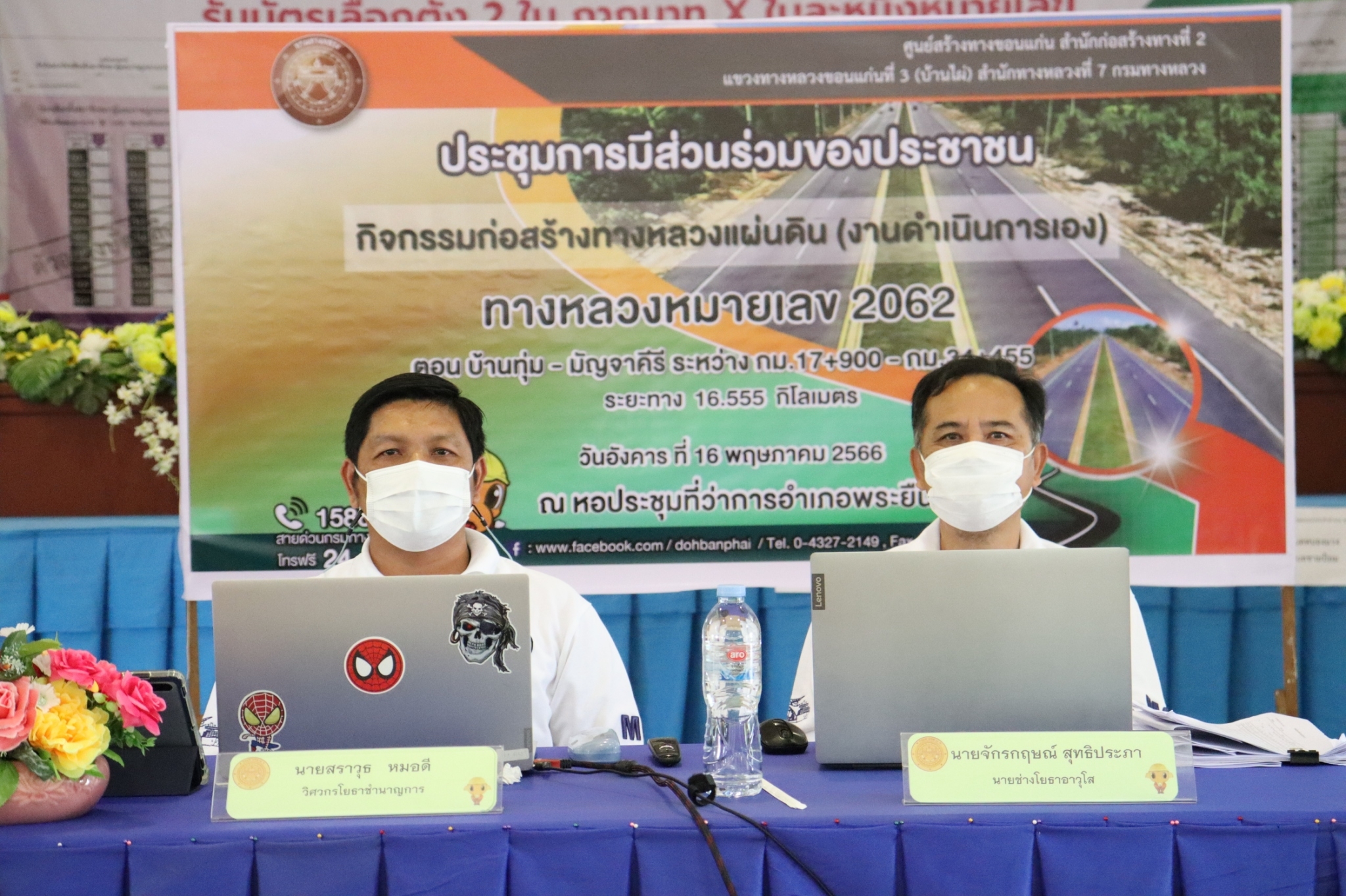 ศูนย์สร้างทางขอนแก่น สำนักก่อสร้างทางที่ 2 ร่วมกับแขวงทางหลวงขอนแก่นที่ 3 (บ้านไผ่) โดย นายสมเจตน์ เขื่อนเพชร ผู้อำนวยการแขวงทางหลวงขอนแก่นที่ 3 (บ้านไผ่)พร้อมด้วยคณะทำงานจากศูนย์สร้างทางขอนแก่นฯ นายสมัคร ต้นโลห์ วิศวกรโยธาชำนาญการพิเศษ ผู้อำนวยการฝ่ายสำรวจและออกแบบ นายจักรกฤษณ์ สุทธิประภา นายช่างโยธาอาวุโส นายสราวุธ หมอดี วิศวกรโยธาชำนาญการ และเจ้าหน้าที่ที่เกี่ยวข้อง จัดกิจกรรมประชุมการมีส่วนร่วมรับฟังความคิดเห็นของประชาชน โครงการกิจกรรมก่อสร้างทางหลวงแผ่นดิน ทางหลวงหมายเลข 2062 ตอน บ้านทุ่ม - มัญจาคีรี ระหว่าง กม.17+900 กม.34+455 ระยะทาง 16.555 กิโลเมตร เพื่อให้ข้อมูลรายละเอียดรูปแบบการก่อสร้าง พร้อมรับฟังข้อคิดเห็นข้อเสนอแนะที่เป็นประโยชน์ต่อโครงการฯ จากหัวหน้าหน่วยงาน ผู้แทนหน่วยงาน ผู้นำชุมชน และประชาชนผู้มีส่วนได้ส่วนเสียต่อโครงการฯ เพื่อนำไปประกอบการพิจารณาและพัฒนาโครงการฯ ให้มีความเหมาะสมกับสภาพบริบทชุมชนต่อไป โดยมี นายสรันย์ พานจันทร์ นายอำเภอพระยืน เป็นประธานในโครงการประชุมการมีส่วนร่วมรับฟังความเห็นของประชาชน ดังกล่าว