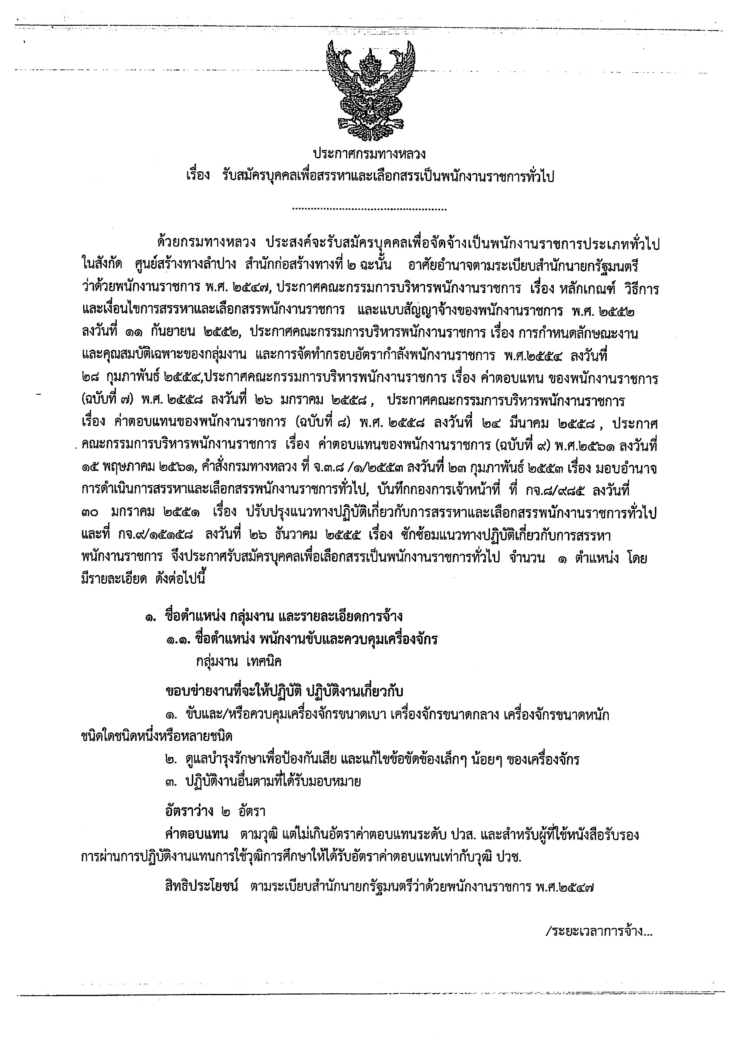 ประกาศรับสมัครบุคคล เพื่อสรรหาและเลือกสรรเป็นพนักงานราชการทั่วไป ตำแหน่ง พนักงานขับและควบคุมเครื่องจักร