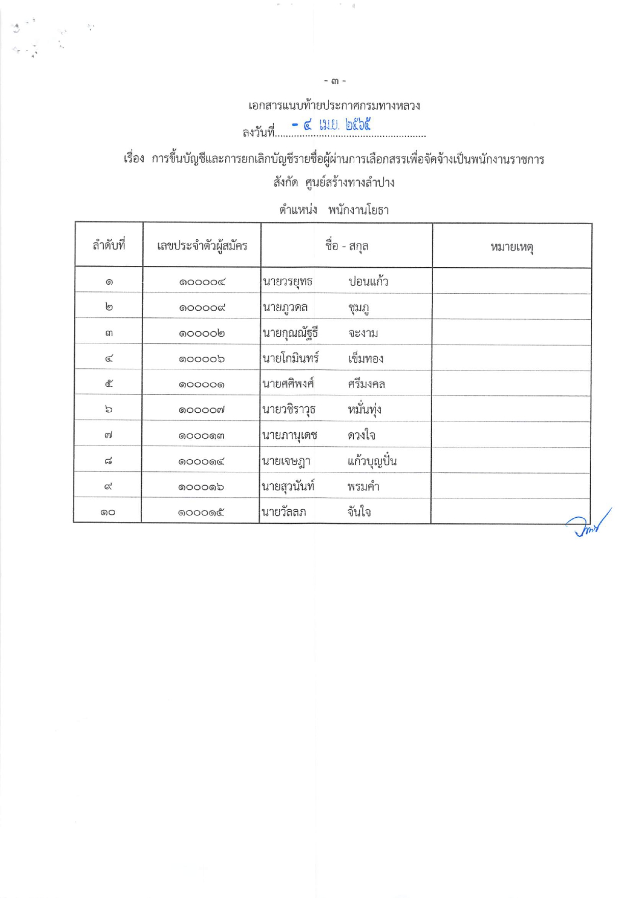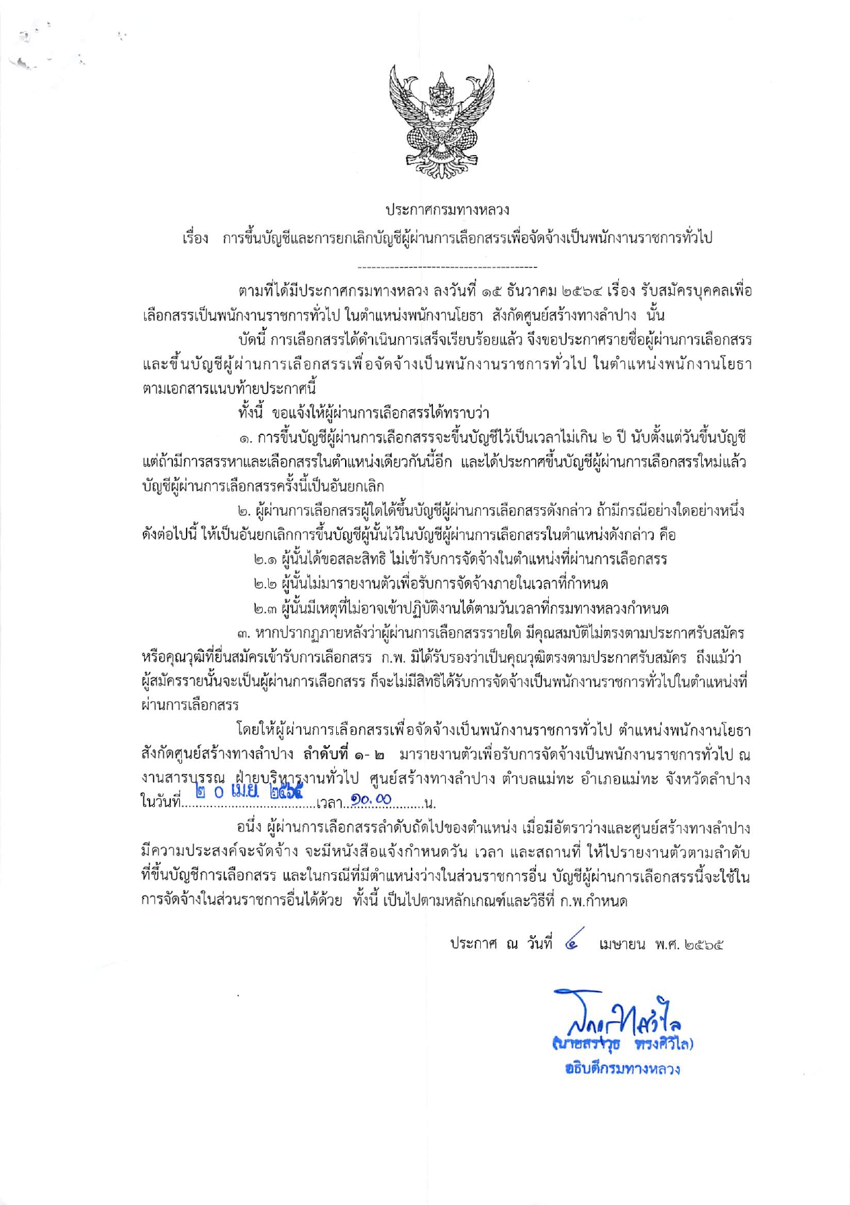 ประกาศการขึ้นบัญชีและการยกเลิกบัญชีรายชื่อผู้ผ่านการเลือกสรรเพื่อจัดจ้างเป็นพนักงานราชการทั่วไป ตำแหน่ง พนักงานโยธา