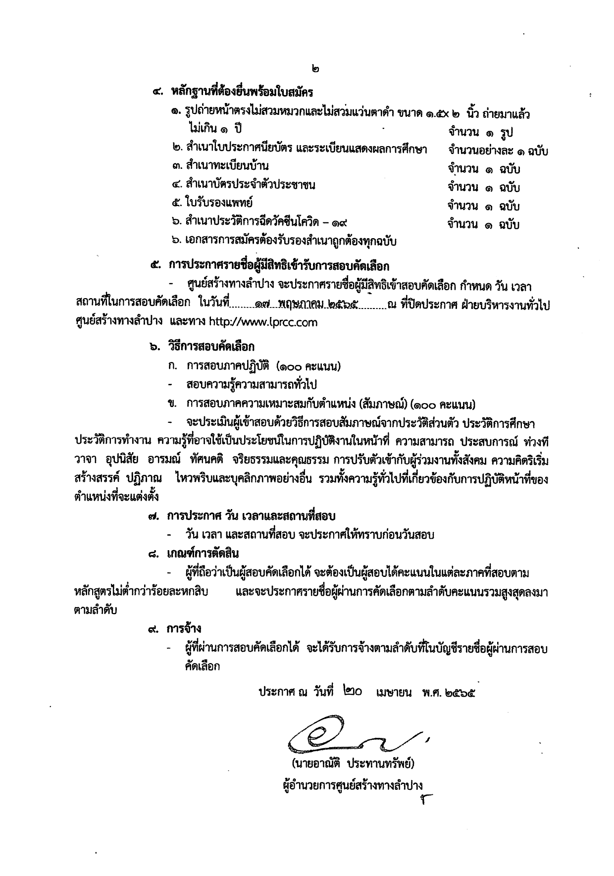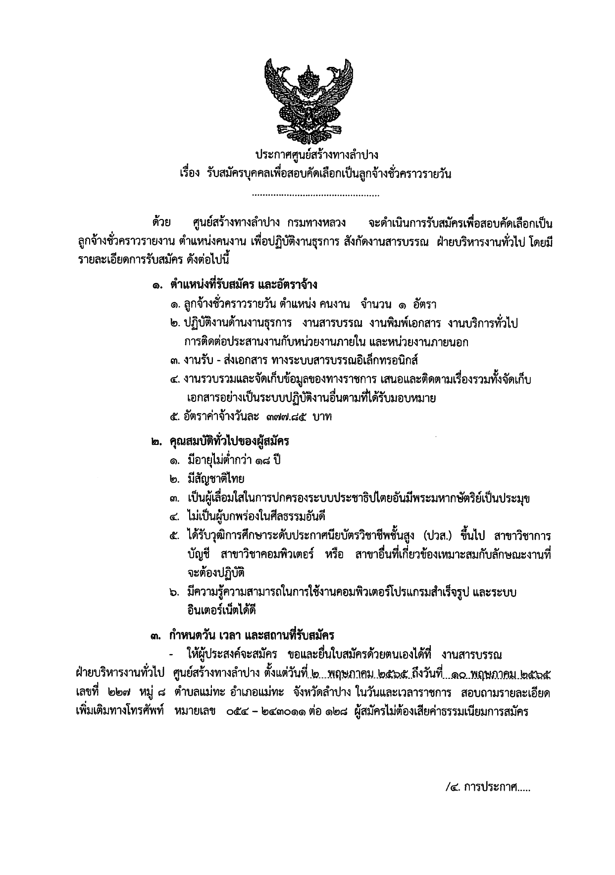 ประกาศศูนย์สร้างทางลำปาง เรื่อง รับสมัครบุคคลเพื่อสอบคัดเลือกเป็นลูกจ้างชั่วคราวรายวัน