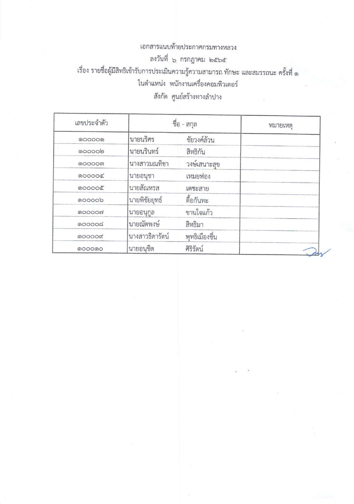 ประกาศรายชื่อผู้มีสิทธ์เข้ารับการประเมินสมรรถนะครั้งที่ 1 กำหนดวันและสถานที่ประเมินสมรรถนะเพื่อเลือกสรรเป็นพนักงานราชการทั่วไป