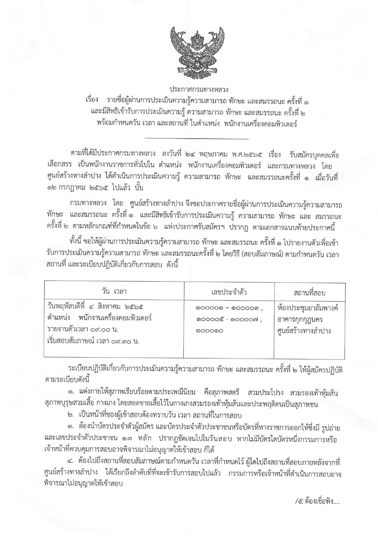 ประกาศรายชื่อผู้ผ่านการประเมินสมรรถนะ ครั้งที่ 1 และมีสิทธิ์เข้ารับการประเมินสมรรถนะ ครั้งที่ 2 ในตำแหน่ง พนักงานเครื่องคอมพิวเตอร์