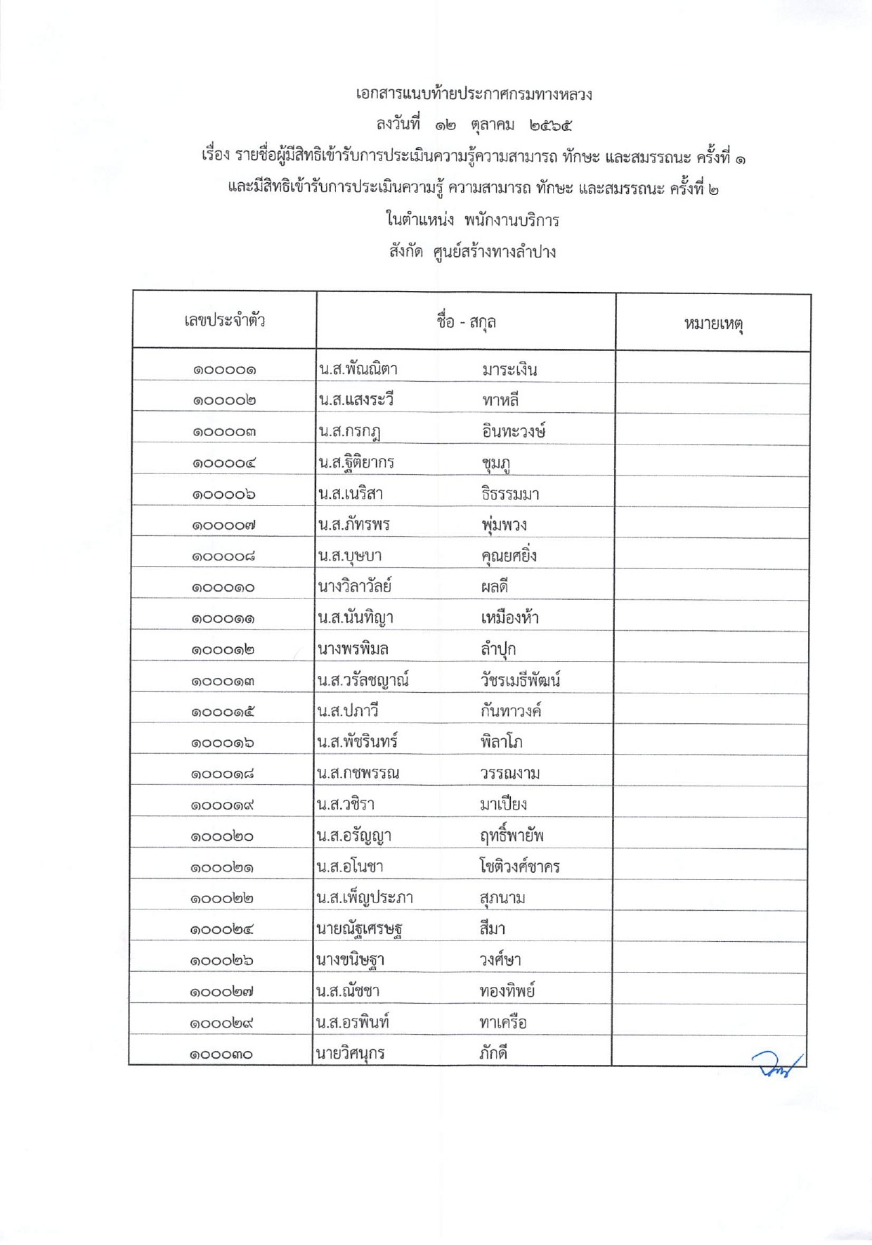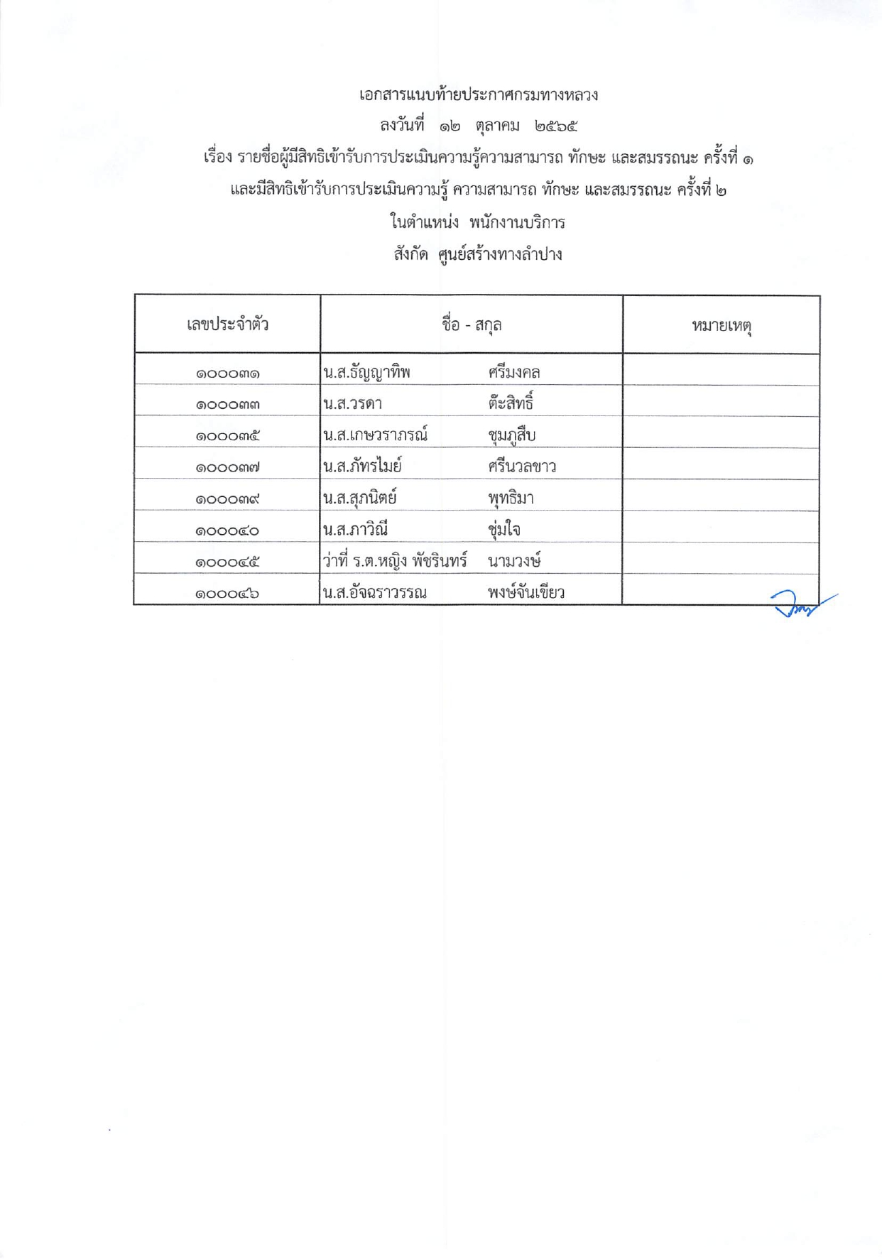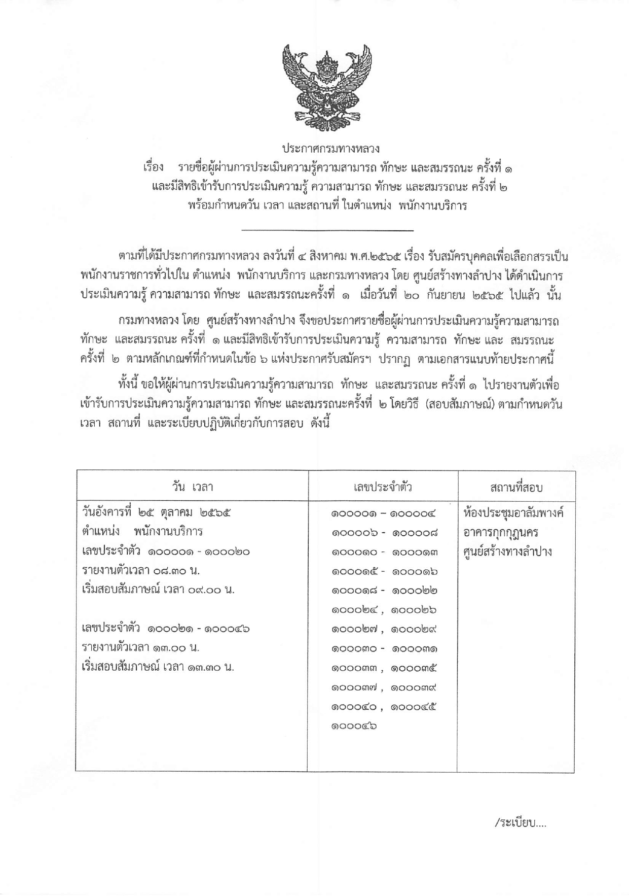 ประกาศรายชื่อผู้ผ่านการประเมินสมรรถนะ ครั้งที่ 1 และมีสิทธิ์เข้ารับการประเมินสมรรถนะ ครั้งที่ 2 ในตำแหน่ง พนักงานบริการ