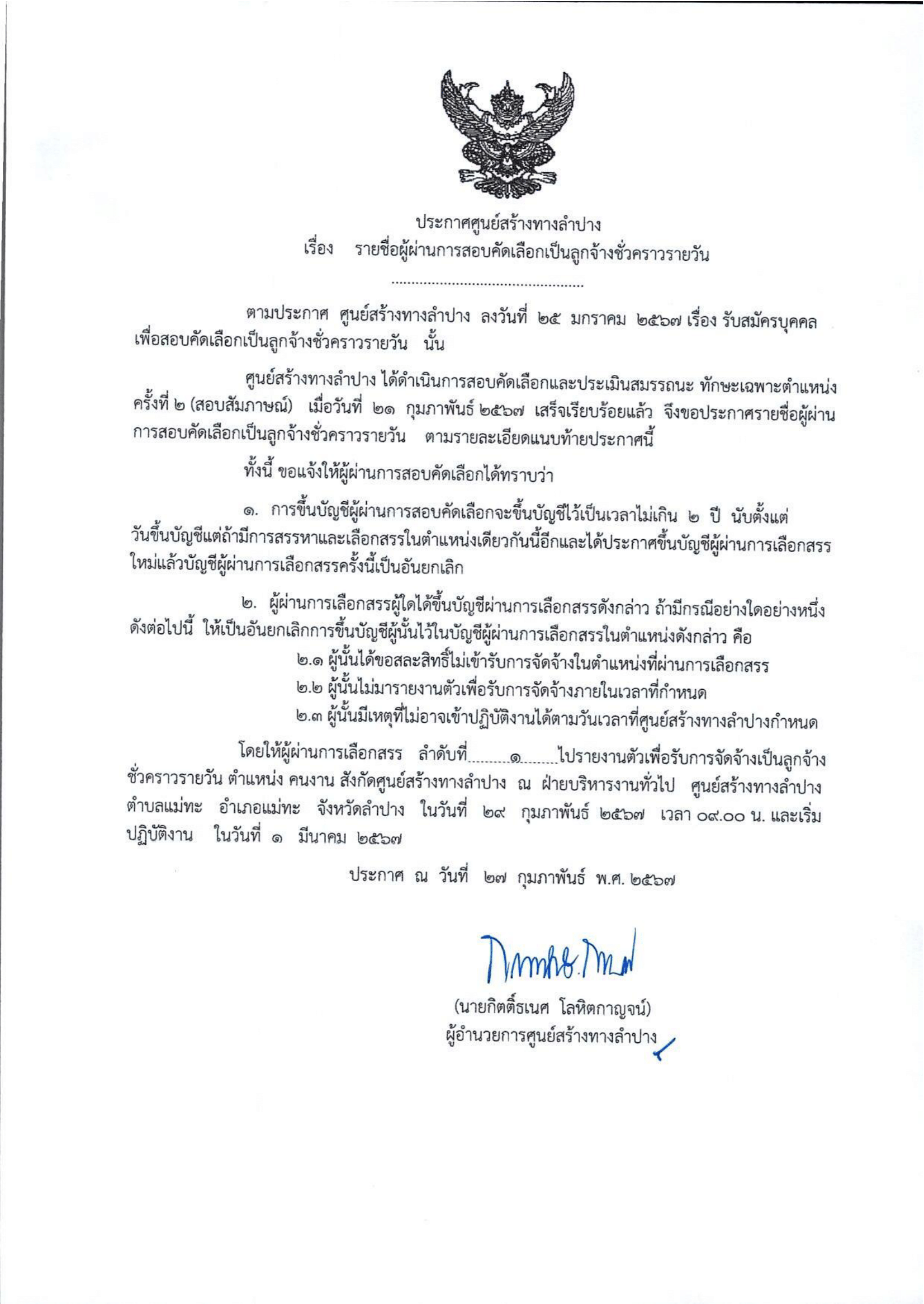 ประกาศรายชื่อผู้ผ่านการสอบคัดเลือกเป็นลูกจ้างชั่วคราวรายวัน