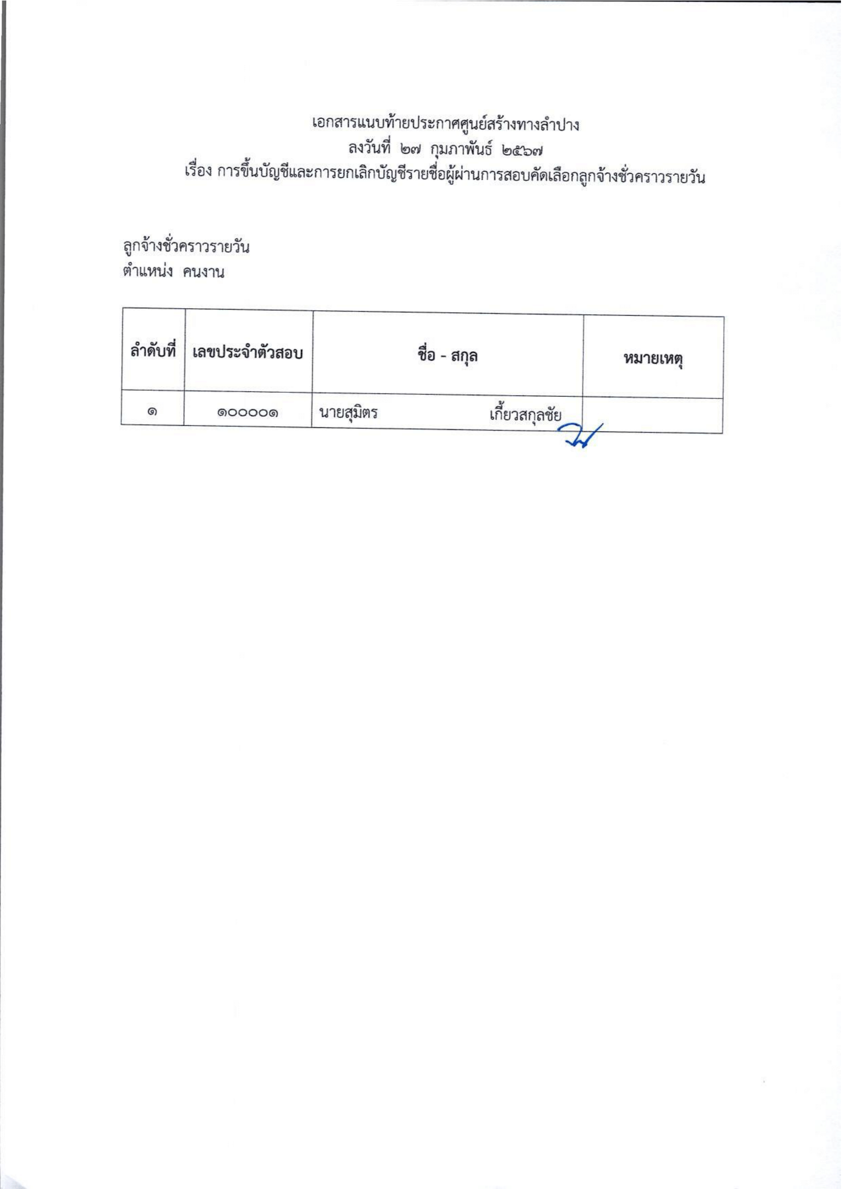 รายชื่อผู้ผ่านการสอบคัดเลือกเป็นลูกจ้างชั่วคราวรายวัน