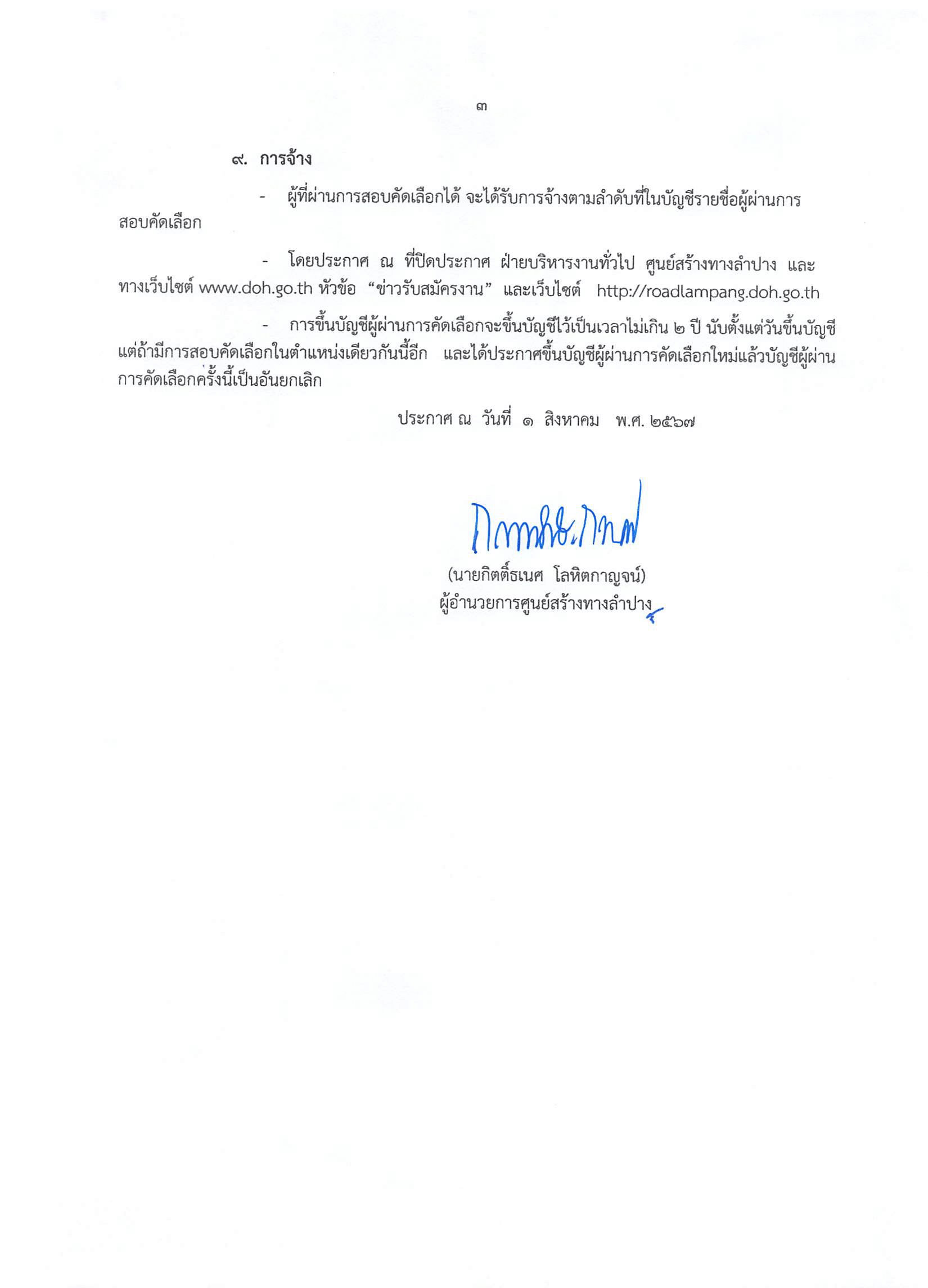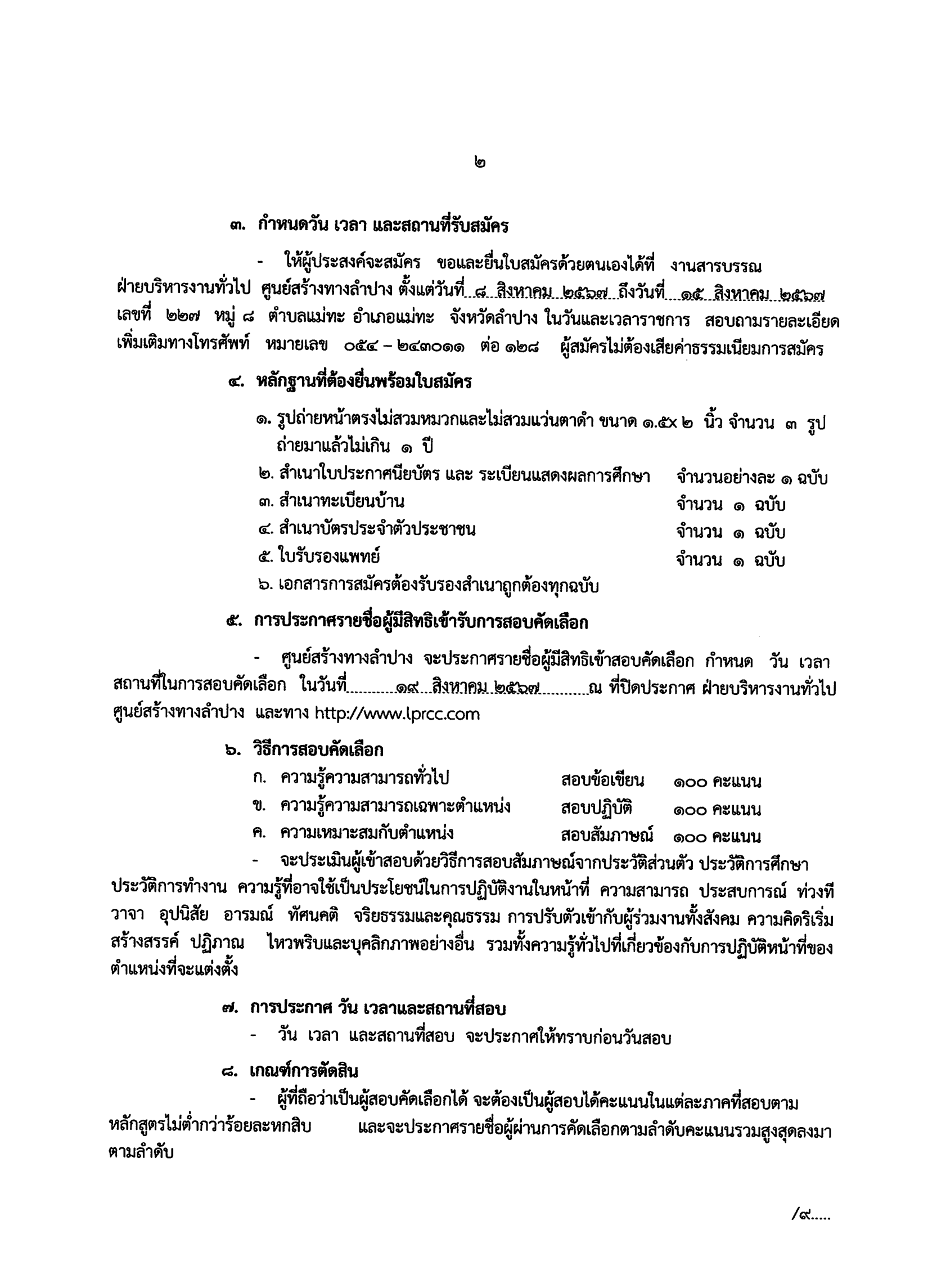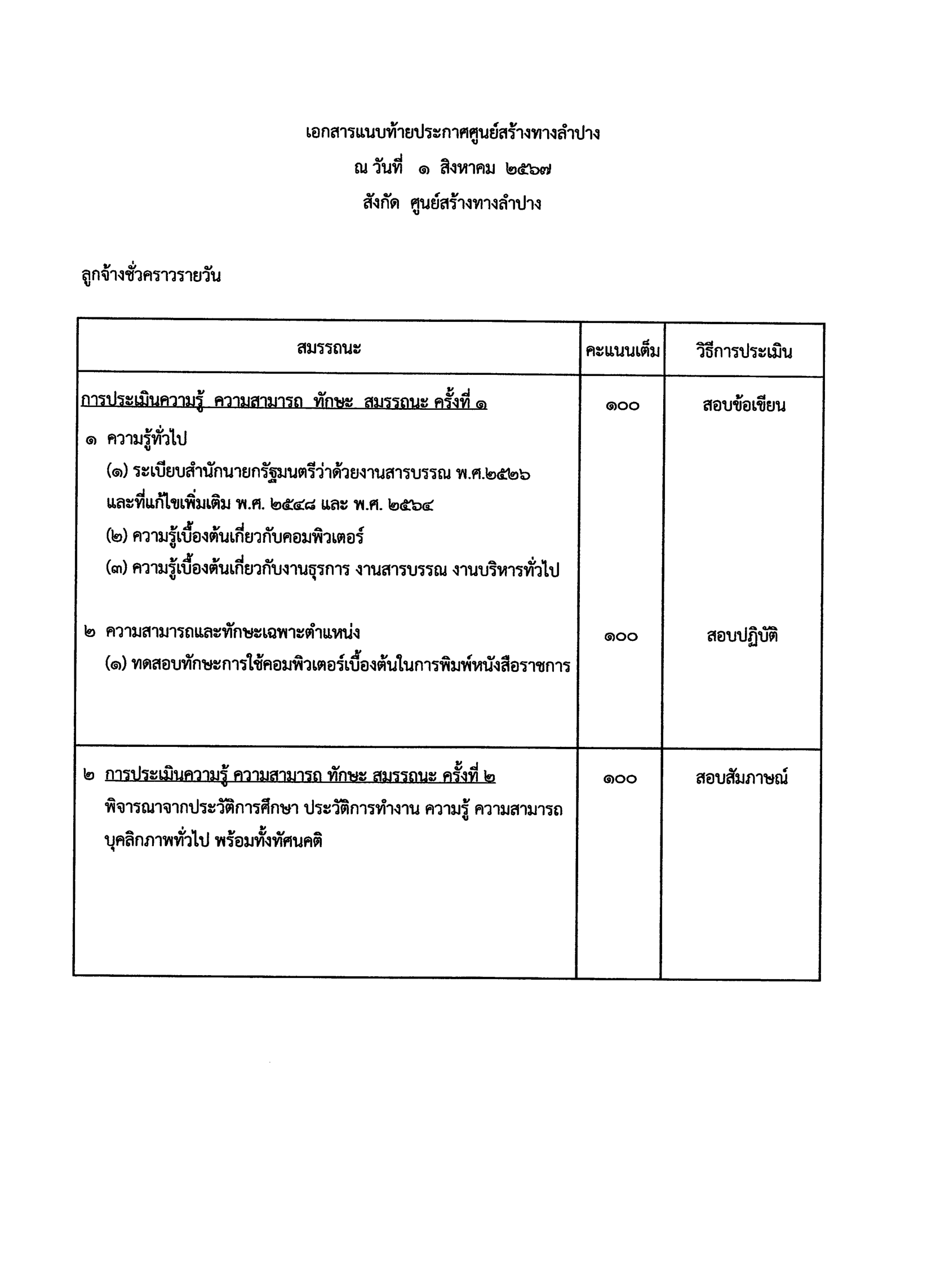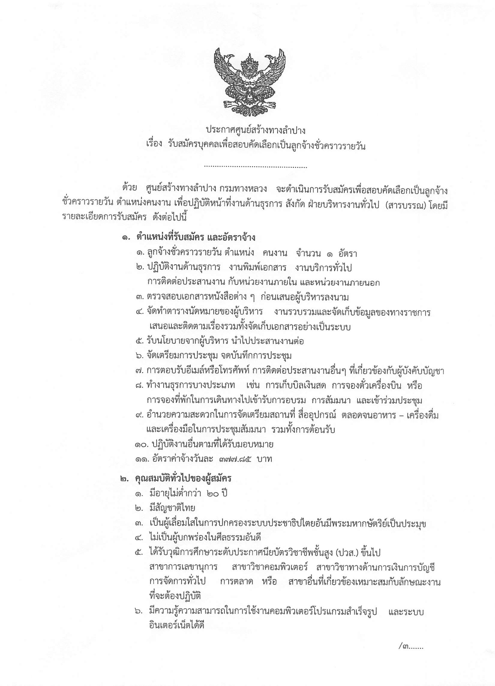 ประกาศศูนย์สร้างทางลำปาง เรื่อง รับสมัครบุคคลเพื่อสอบคัดเลือกเป็นลูกจ้างชั่วคราวรายวัน