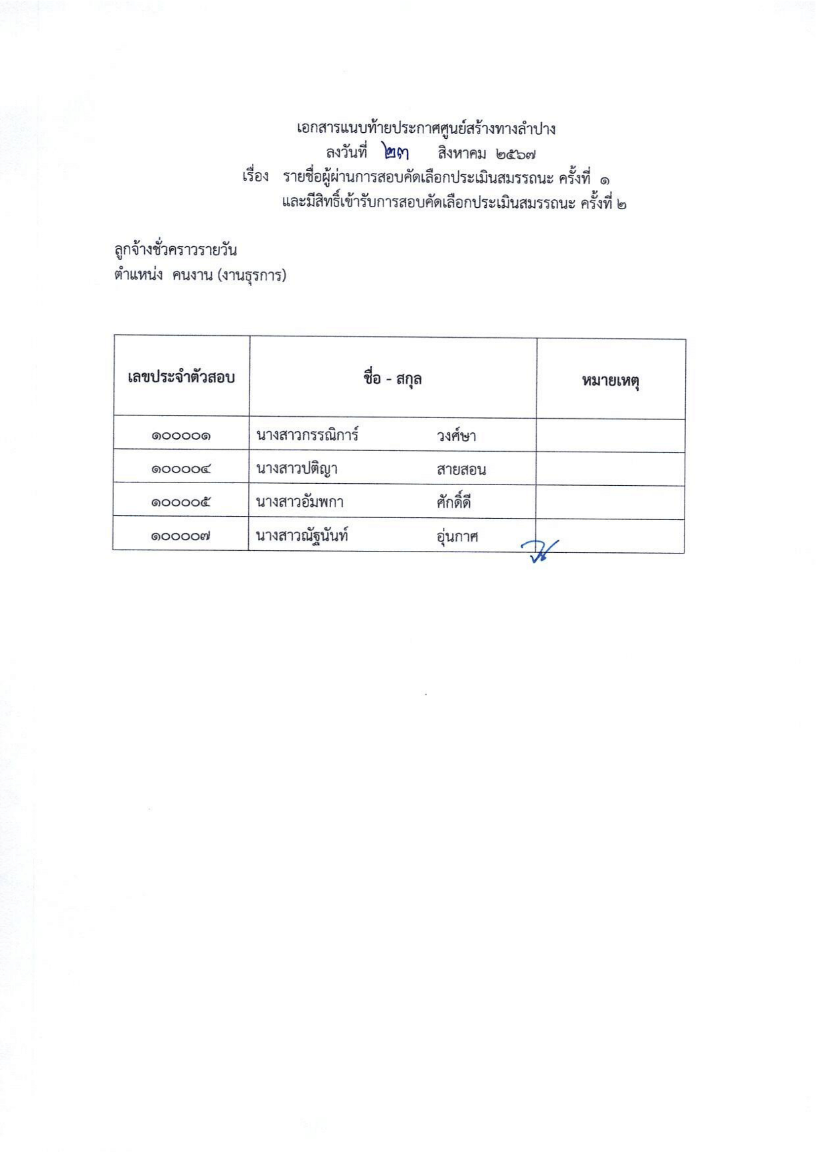 รายชื่อผู้ผ่านการประเมิน รอบ1 ลูกจ้างชั่วคราว ตำแหน่ง ธุรการ