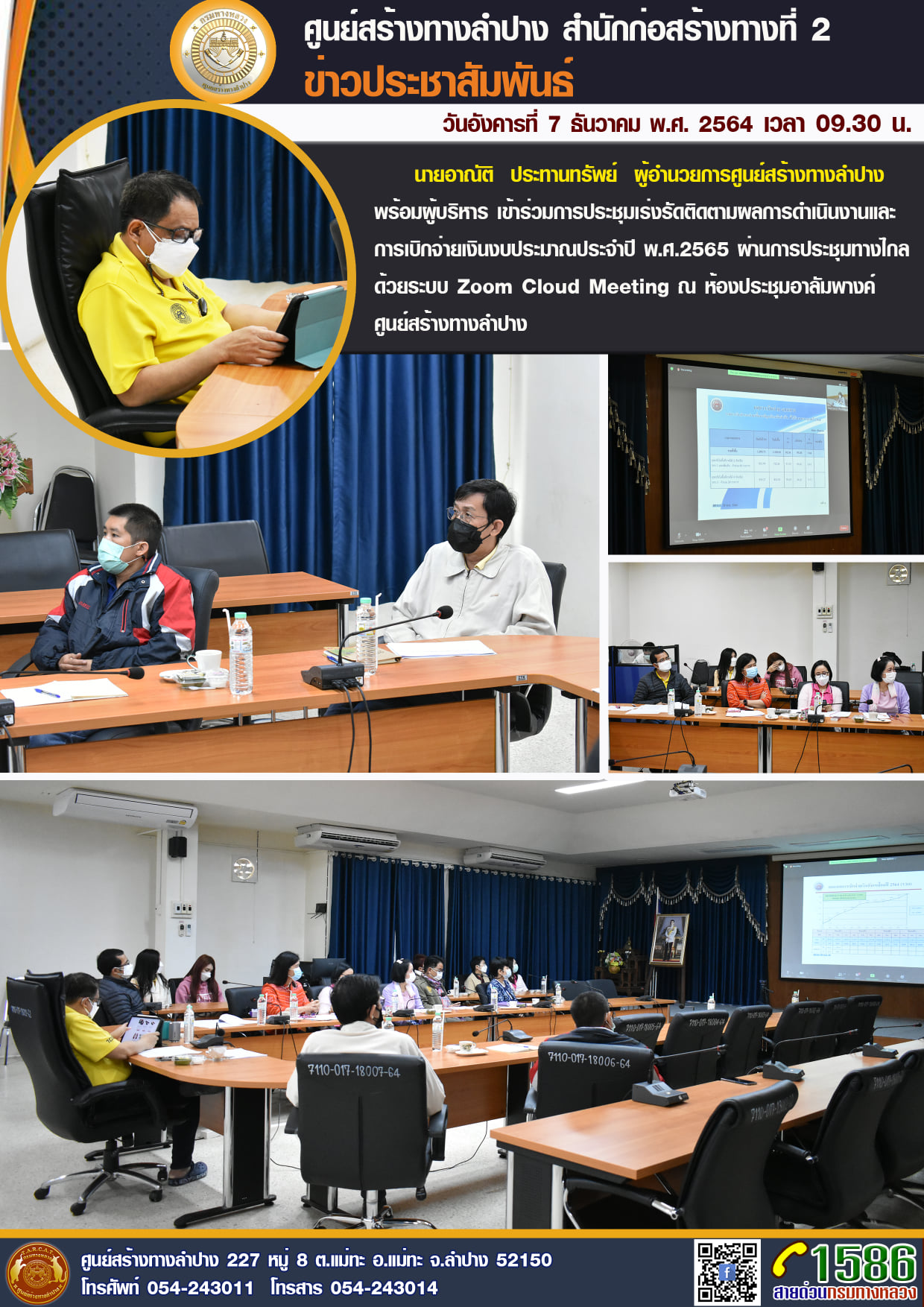 นายอาณัติ ประทานทรัพย์ ผู้อำนวยการศูนย์สร้างทางลำปาง พร้อมผู้บริหาร เข้าร่วมการประชุมเร่งรัดติดตามผลการดำเนินงานและการเบิกจ่ายเงินงบประมาณประจำปี พ.ศ.2565 ผ่านการประชุมทางไกลด้วยระบบ Zoom Cloud Meeting ณ ห้องประชุมอาลัมพางค์ ศูนย์สร้างทางลำปาง