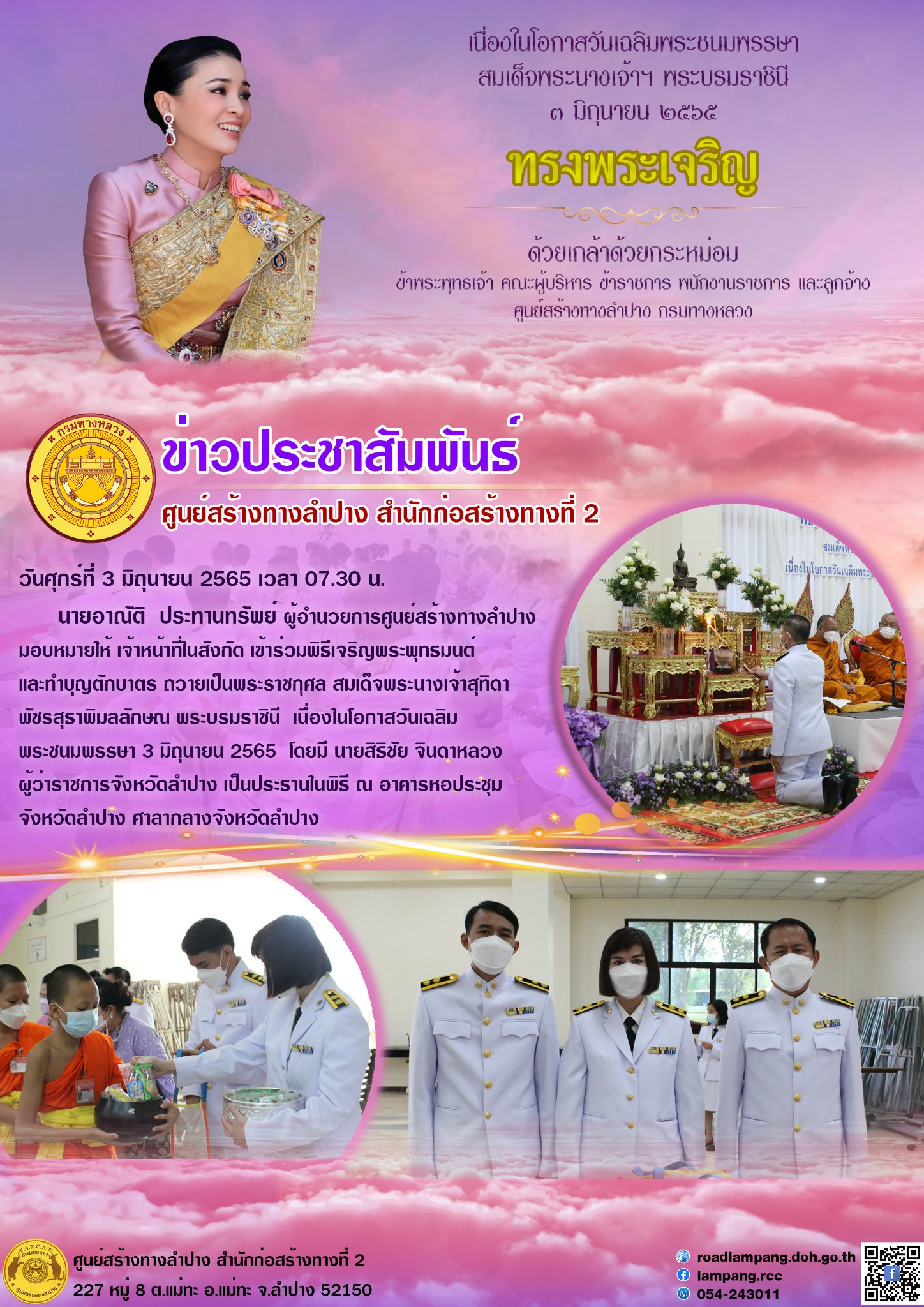นายอาณัติ ประทานทรัพย์ ผู้อำนวยการศูนย์สร้างทางลำปางมอบหมายให้ เจ้าหน้าที่ในสังกัด เข้าร่วมพิธีเจริญพระพุทธมนต์ และทำบุญตักบาตร ถวายเป็นพระราชกุศล สมเด็จพระนางเจ้าสุทิดา พัชรสุธาพิมลลักษณ พระบรมราชินี เนื่องในโอกาสวันเฉลิมพระชนมพรรษา 3 มิถุนายน 2565 โดยมี นายสิธิชัย จินดาหลวง ผู้ว่าราชการจังหวัดลำปาง เป็นประธานในพิธี ณ อาคารหอประชุมจังหวัดลำปาง ศาลากลางจังหวัดลำปาง