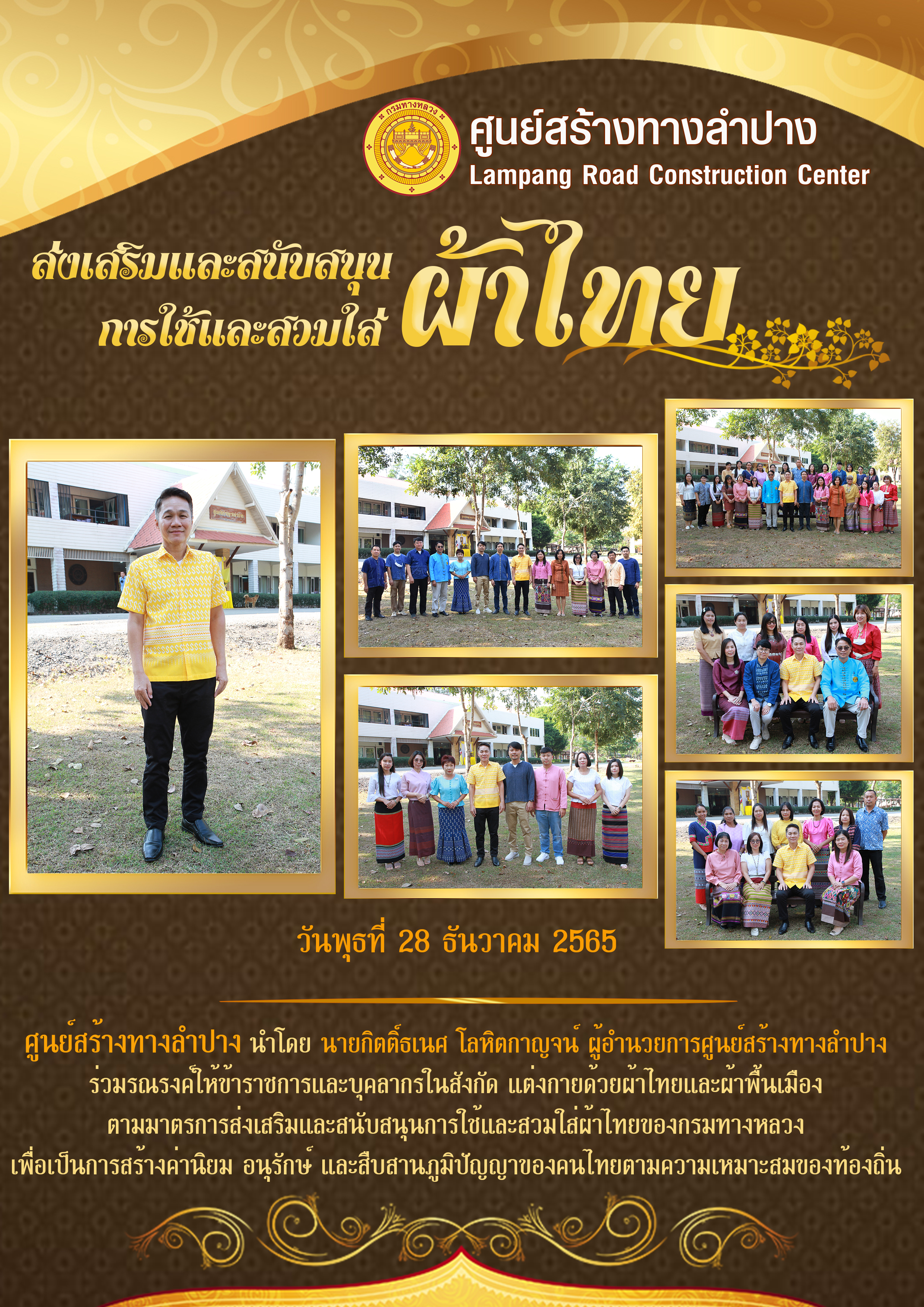ศูนย์สร้างทางลำปาง นำโดย นายกิตติ์ธเนศ โลหิตกาญจน์ ผู้อำนวยการศูนย์สร้างทางลำปาง ร่วมรณรงค์ให้ข้าราชการและบุคลากรในสังกัด แต่งกายด้วยผ้าไทยและผ้าพื้นเมือง ตามมาตรการส่งเสริมและสนับสนุนการใช้และสวมใส่ผ้าไทยของกรมทางหลวง เพื่อเป็นการสร้างค่านิยม อนุรักษ์ และสืบสานภูมิปัญญาของคนไทยตามความเหมาะสมของท้องถิ่น
