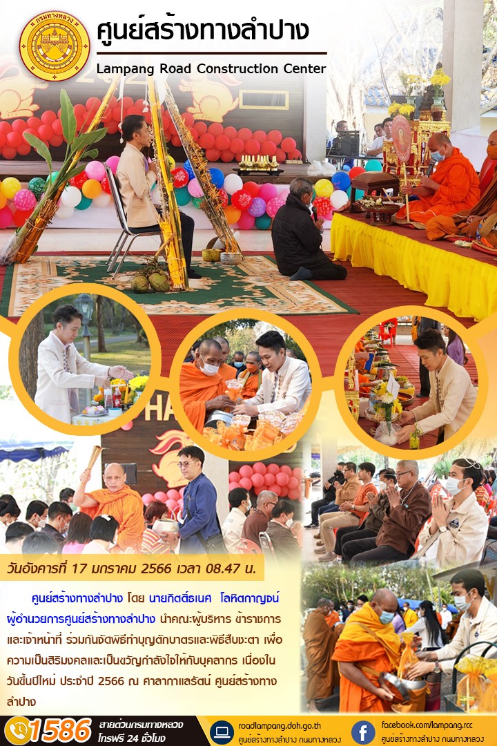 ศูนย์สร้างทางลำปาง โดย นายกิตติ์ธเนศ โลหิตกาญจน์ ผู้อำนวยการศูนย์สร้างทางลำปาง นำคณะผู้บริหาร ข้าราชการ และเจ้าหน้าที่ ร่วมกันจัดพิธีทำบุญตักบาตรและพิธีสืบชะตา เพื่อความเป็นสิริมงคลและเป็นขวัญกำลังใจให้กับบุคลากร เนื่องในวันขึ้นปีใหม่ ประจำปี 2566 ณ ศาลากาแลรัตน์ ศูนย์สร้างทางลำปาง