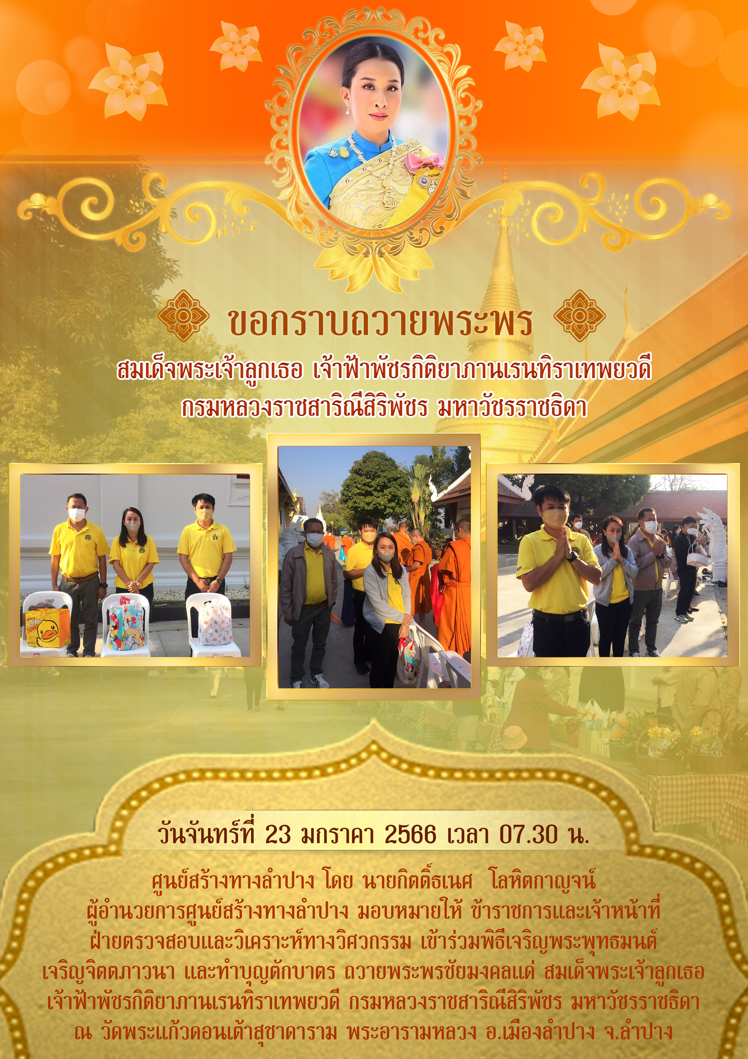 ศูนย์สร้างทางลำปาง โดย นายกิตติ์ธเนศ โลหิตกาญจน์ ผู้อำนวยการศูนย์สร้างทางลำปาง มอบหมายให้ ข้าราชการและเจ้าหน้าที่ ฝ่ายตรวจสอบและวิเคราะห์ทางวิศวกรรม เข้าร่วมพิธีเจริญพระพุทธมนต์ เจริญจิตตภาวนา และทำบุญตักบาตร ถวายพระพรชัยมงคลแด่ สมเด็จพระเจ้าลูกเธอ เจ้าฟ้าพัชรกิติยาภานเรนทิราเทพยวดี กรมหลวงราชสาริณีสิริพัชร มหาวัชรราชธิดา ณ วัดพระแก้วดอนเต้าสุชาดาราม พระอารามหลวง อ.เมืองลำปาง จ.ลำปาง