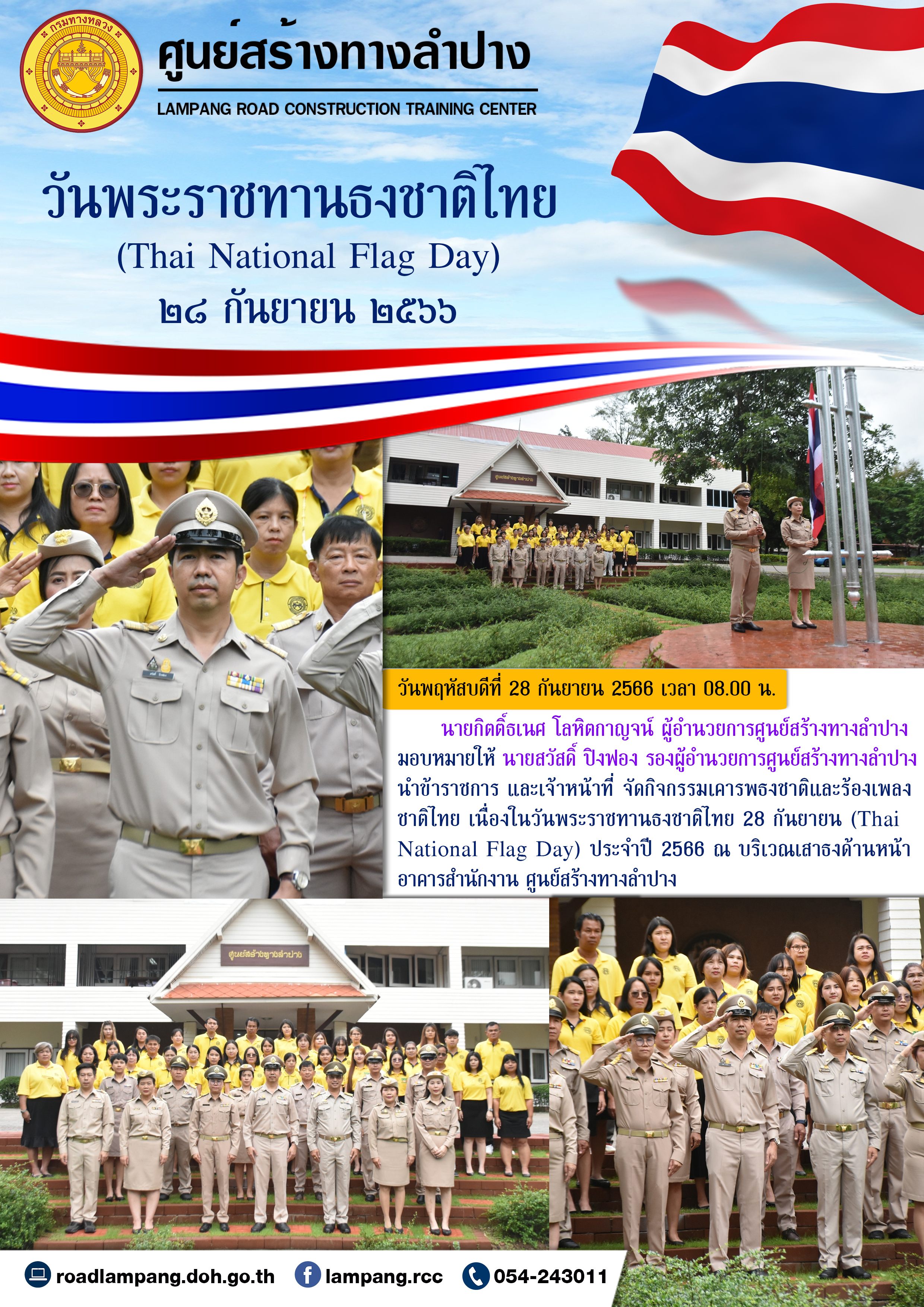นายกิตติ์ธเนศ โลหิตกาญจน์ ผู้อำนวยการศูนย์สร้างทางลำปาง มอบหมายให้ นายสวัสดิ์ ปิงฟอง รองผู้อำนวยการศูนย์สร้างทางลำปางนำข้าราชการ และเจ้าหน้าที่ จัดกิจกรรมเคารพธงชาติและร้องเพลงชาติไทย เนื่องในวันพระราชทานธงชาติไทย 28 กันยายน (Thai National Flag Day) ประจำปี 2566 ณ บริเวณเสาธงด้านหน้าอาคารสำนักงาน ศูนย์สร้างทางลำปาง