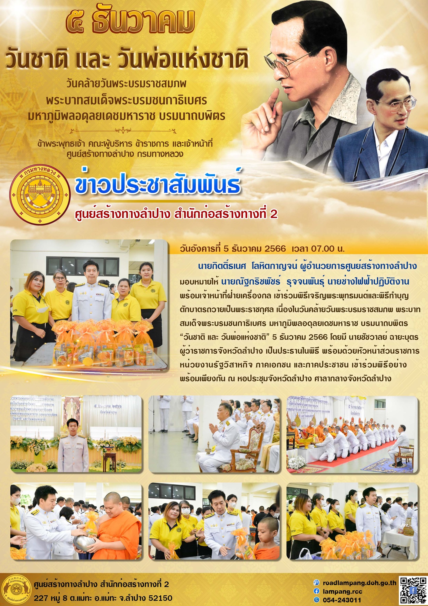 นายกิตติ์ธเนศ โลหิตกาญจน์ ผู้อำนวยการศูนย์สร้างทางลำปาง มอบหมายให้ นายณัฐกริชพัชร์ รุจจนพันธุ์ นายช่างไฟฟ้าปฏิบัติงาน พร้อมเจ้าหน้าที่ฝ่ายเครื่องกล เข้าร่วมพิธีเจริญพระพุทธมนต์และพิธีทำบุญตักบาตรถวายเป็นพระราชกุศล เนื่องในวันคล้ายวันพระบรมราชสมภพ พระบาทสมเด็จพระบรมชนกาธิเบศร มหาภูมิพลอดุลยเดชมหาราช บรมนาถบพิตร “วันชาติ และ วันพ่อแห่งชาติ” 5 ธันวาคม 2566 โดยมี นายชัชวาลย์ ฉายะบุตร ผู้ว่าราชการจังหวัดลำปาง เป็นประธานในพิธี พร้อมด้วยหัวหน้าส่วนราชการ หน่วยงานรัฐวิสาหกิจ ภาคเอกชน และภาคประชาชน เข้าร่วมพิธีอย่างพร้อมเพียงกัน ณ หอประชุมจังหวัดลำปาง ศาลากลางจังหวัดลำปาง
