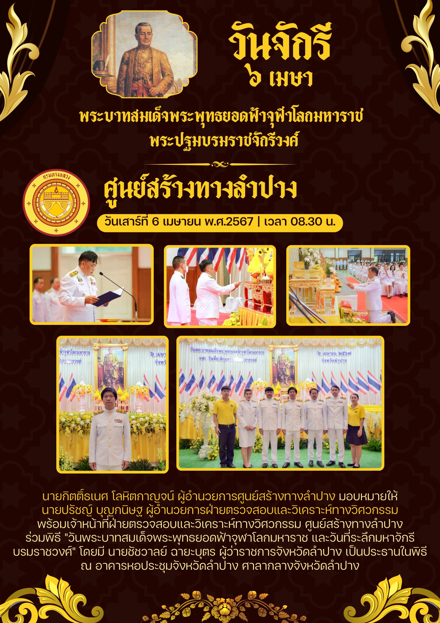 นายกิตติ์ธเนศ โลหิตกาญจน์ ผู้อำนวยการศูนย์สร้างทางลำปาง มอบหมายให้ นายปรัชญ์ บุญกนิษฐ ผู้อำนวยการฝ่ายตรวจสอบและวิเคราะห์ทางวิศวกรรม พร้อมเจ้าหน้าที่ฝ่ายตรวจสอบและวิเคราะห์ทางวิศวกรรม ศูนย์สร้างทางลำปาง ร่วมพิธี "วันพระบาทสมเด็จพระพุทธยอดฟ้าจุฬาโลกมหาราช และวันที่ระลึกมหาจักรีบรมราชวงศ์" โดยมี นายชัชวาลย์ ฉายะบุตร ผู้ว่าราชการจังหวัดลำปาง เป็นประธานในพิธี ณ อาคารหอประชุมจังหวัดลำปาง ศาลากลางจังหวัดลำปาง