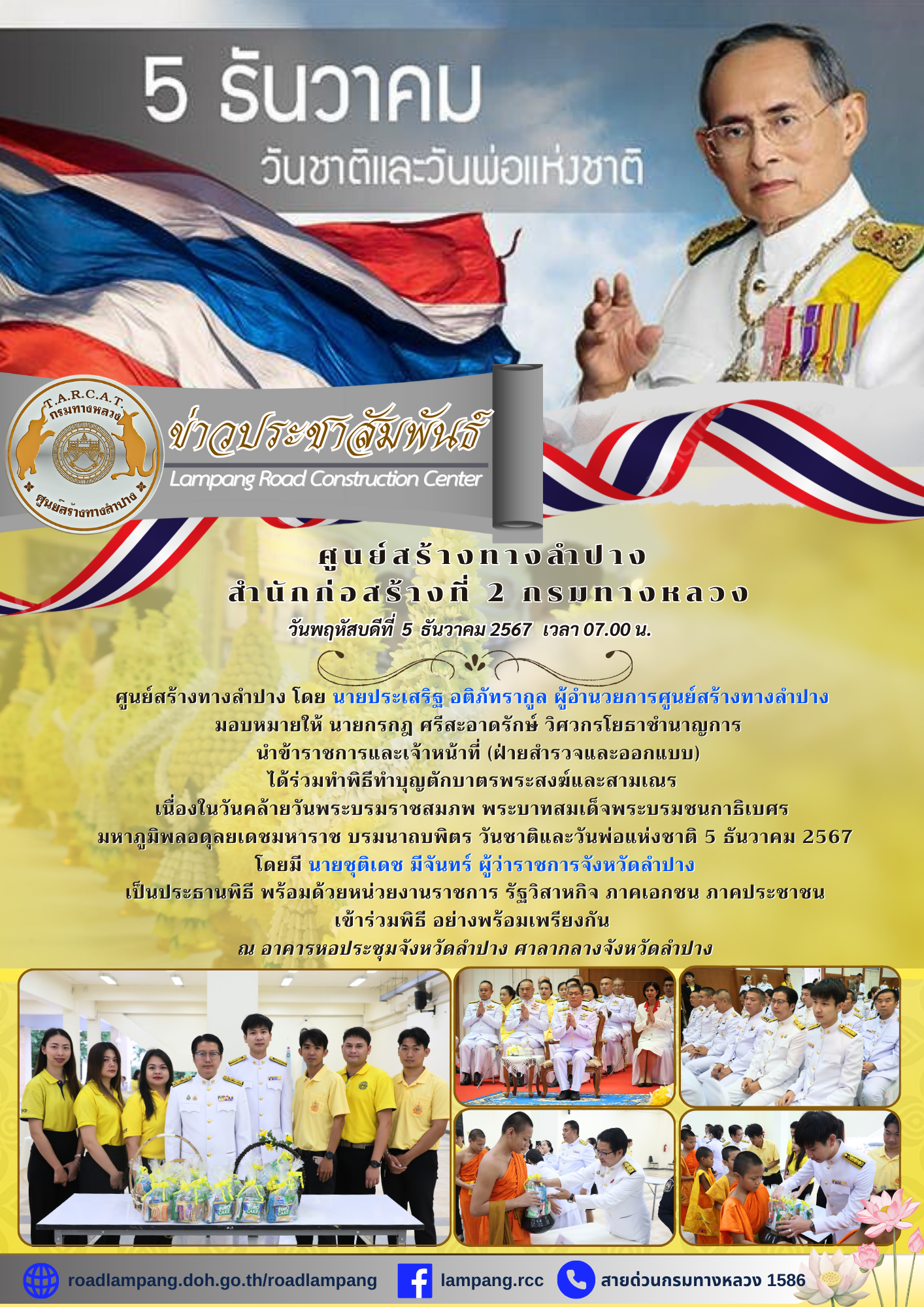 ได้ร่วมทำพิธีทำบุญตักบาตรพระสงฆ์และสามเณร เนื่องในวันคล้ายวันพระบรมราชสมภพ พระบาทสมเด็จพระบรมชนกาธิเบศร มหาภูมิพลอดุลยเดชมหาราช บรมนาถบพิตร วันชาติและวันพ่อแห่งชาติ 5 ธันวาคม 2567 โดยมี นายชุติเดช มีจันทร์ ผู้ว่าราชการจังหวัดลำปางเป็นประธานพิธี พร้อมด้วยหน่วยงานราชการ รัฐวิสาหกิจ ภาคเอกชน ภาคประชาชน เข้าร่วมพิธี อย่างพร้อมเพรียงกัน
