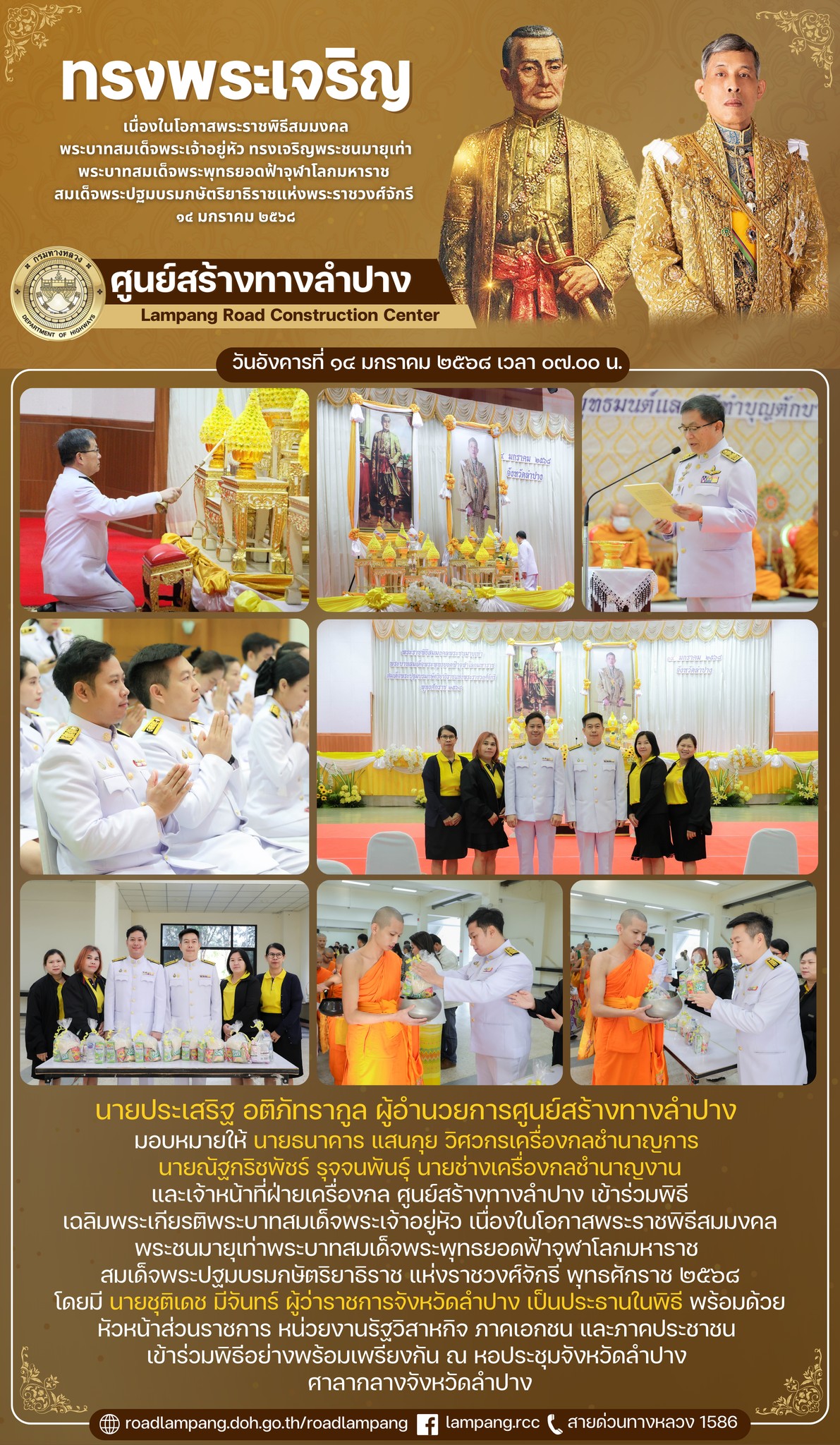 นายประเสริฐ อติภัทรากูล ผู้อำนวยการศูนย์สร้างทางลำปาง มอบหมายให้ นายธนาคาร แสนกุย วิศวกรเครื่องกลชำนาญการ นายณัฐกริชพัชร์ รุจจนพันธุ์ นายช่างเครื่องกลชำนาญงาน และเจ้าหน้าที่ฝ่ายเครื่องกล ศูนย์สร้างทางลำปาง เข้าร่วมพิธีเฉลิมพระเกียรติพระบาทสมเด็จพระเจ้าอยู่หัว เนื่องในโอกาสพระราชพิธีสมมงคลพระชนมายุเท่าพระบาทสมเด็จพระพุทธยอดฟ้าจุฬาโลกมหาราช สมเด็จพระปฐมบรมกษัตริยาธิราช แห่งราชวงศ์จักรี พุทธศักราช ๒๕๖๘ โดยมี นายชุติเดช มีจันทร์ ผู้ว่าราชการจังหวัดลำปาง เป็นประธานในพิธี พร้อมด้วยหัวหน้าส่วนราชการ หน่วยงานรัฐวิสาหกิจ ภาคเอกชน และภาคประชาชน เข้าร่วมพิธีอย่างพร้อมเพรียงกัน ณ หอประชุมจังหวัดลำปาง ศาลากลางจังหวัดลำปาง