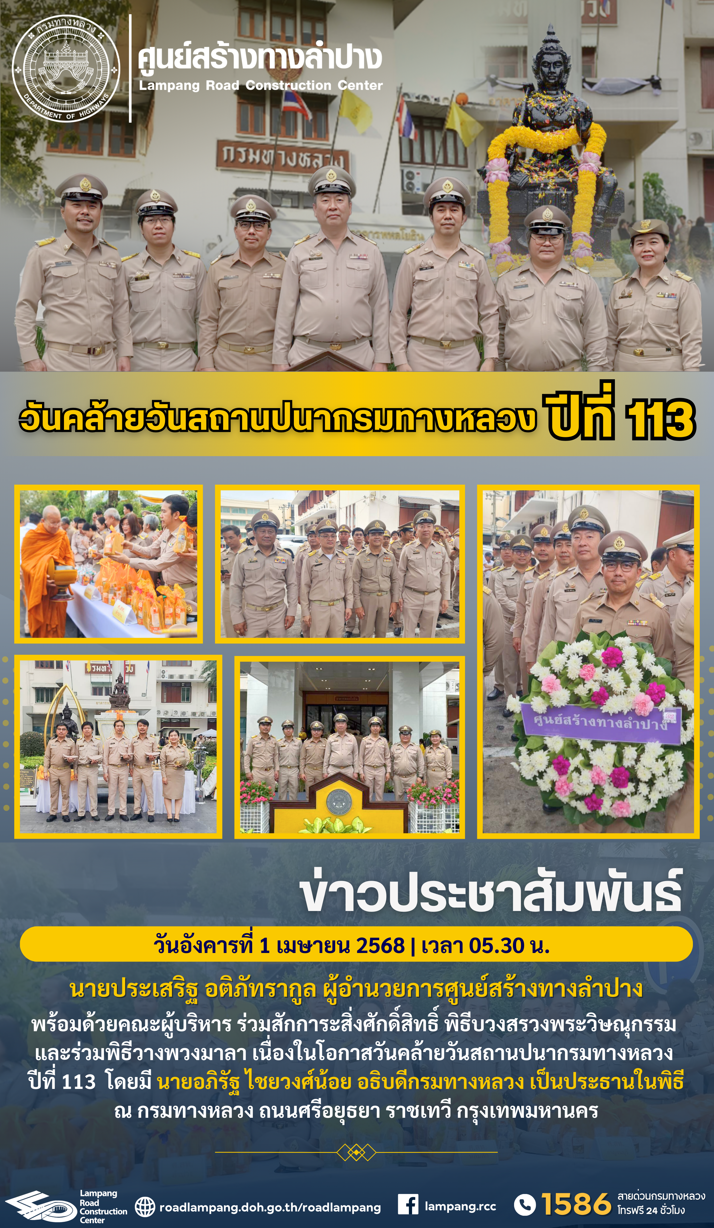 นายประเสริฐ อติภัทรากูล ผู้อำนวยการศูนย์สร้างทางลำปาง พร้อมด้วยคณะผู้บริหาร ร่วมสักการะสิ่งศักดิ์สิทธิ์ พิธีบวงสรวงพระวิษณุกรรม และร่วมพิธีวางพวงมาลา เนื่องในโอกาสวันคล้ายวันสถานปนากรมทางหลวง ปีที่ 113 โดยมี นายอภิรัฐ ไชยวงศ์น้อย อธิบดีกรมทางหลวง เป็นประธานในพิธีณ กรมทางหลวง ถนนศรีอยุธยา ราชเทวี กรุงเทพมหานคร