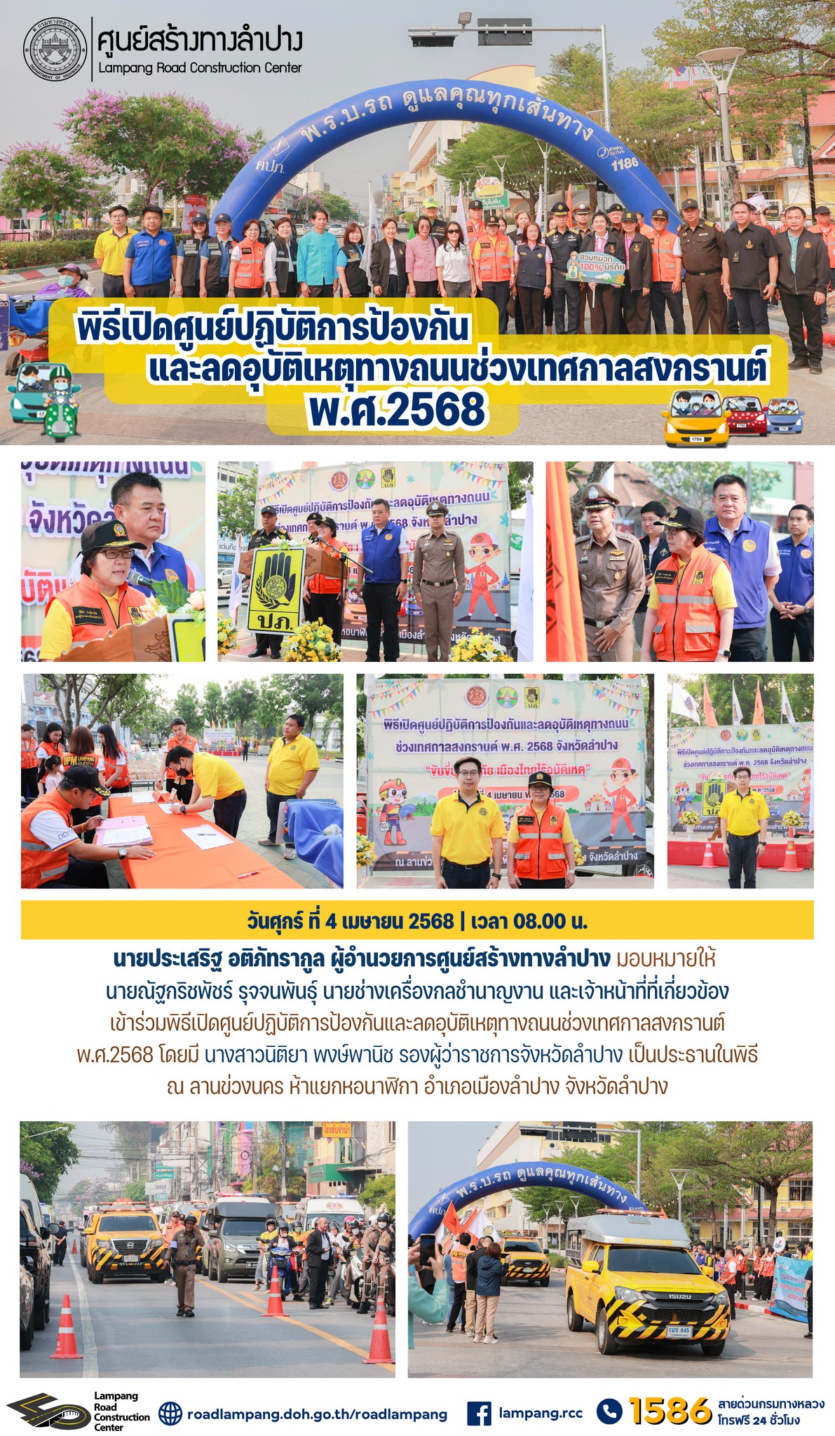 นายประเสริฐ อติภัทรากูล ผู้อำนวยการศูนย์สร้างทางลำปาง มอบหมายให้ นายณัฐกริชพัชร์ รุจจนพันธ์ุ นายช่างเครื่องกลชำนาญงาน และเจ้าหน้าที่ที่เกี่ยวข้อง เข้าร่วมพิธีเปิดศูนย์ปฏิบัติการป้องกันและลดอุบัติเหตุทางถนนช่วงเทศกาลสงกรานต์ พ.ศ.2568 โดยมี นางสาวนิติยา พงษ์พานิช รองผู้ว่าราชการจังหวัดลำปาง เป็นประธานในพิธี ณ ลานข่วงนคร ห้าแยกหอนาฬิกา อำเภอเมืองลำปาง จังหวัดลำปาง