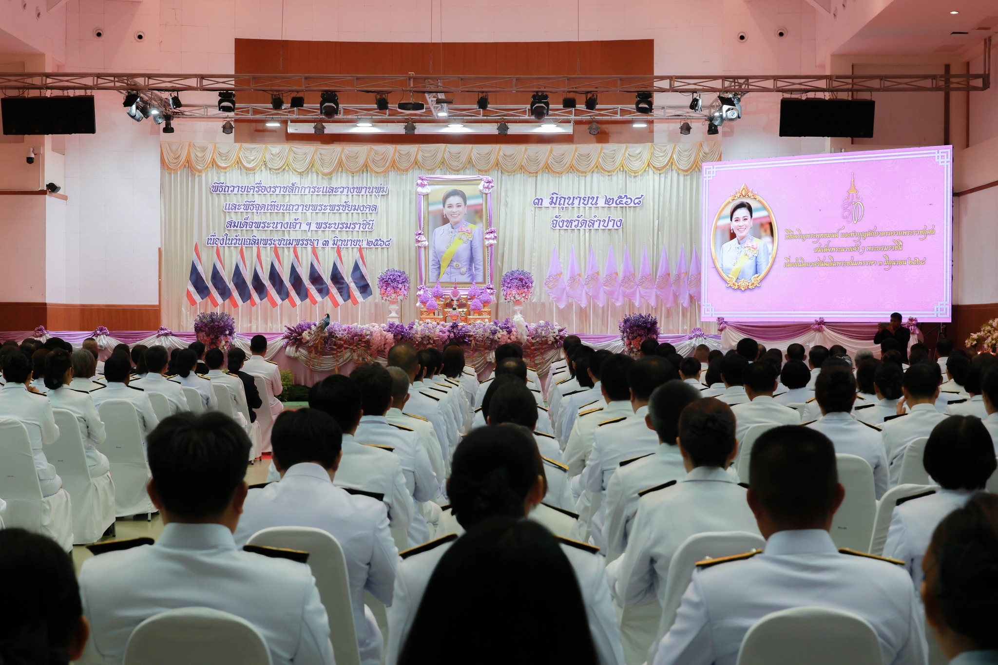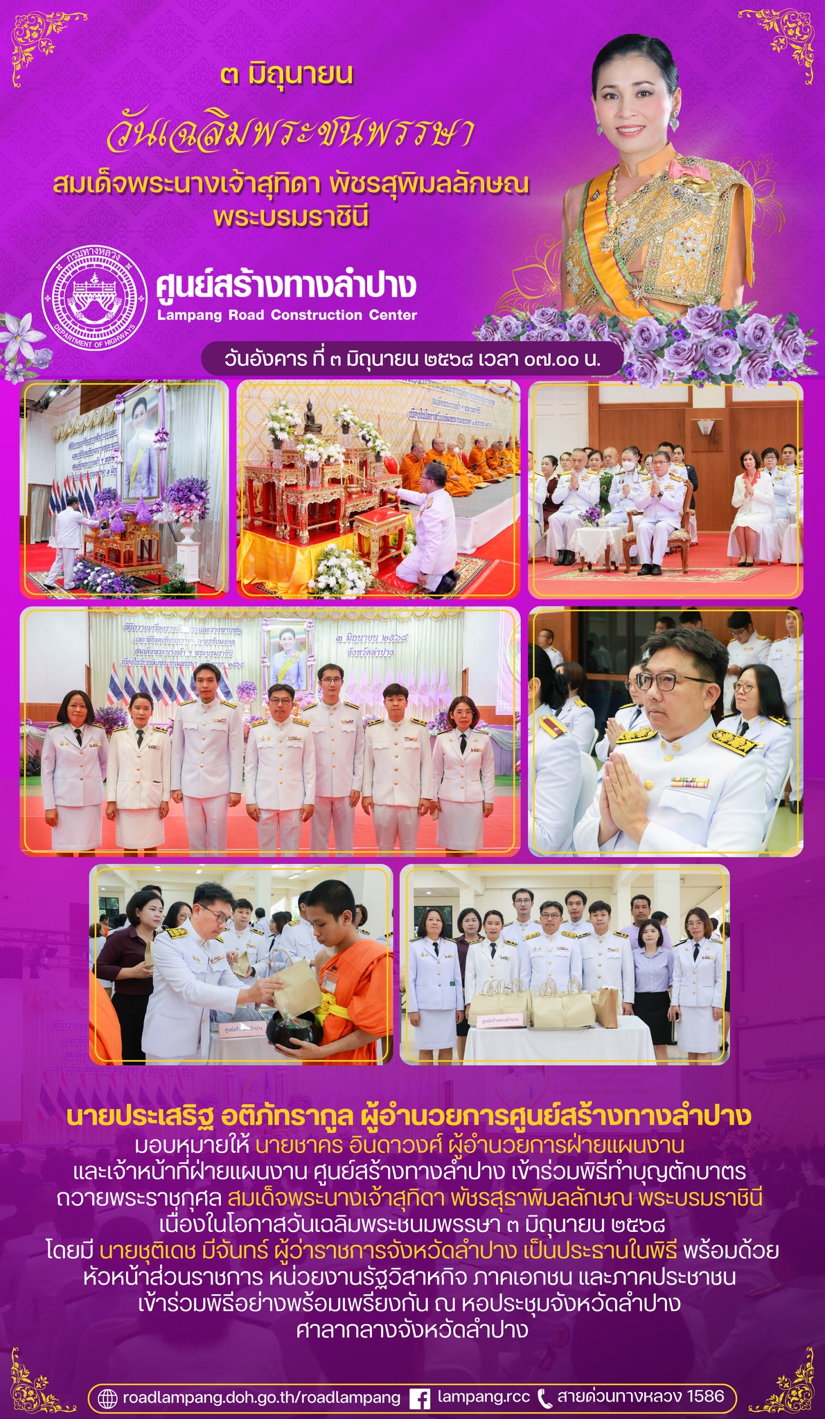 นายประเสริฐ อติภัทรากูล ผู้อำนวยการศูนย์สร้างทางลำปาง มอบหมายให้ นายชาคร อินดาวงศ์ ผู้อำนวยการฝ่ายแผนงาน และเจ้าหน้าที่ฝ่ายแผนงาน ศูนย์สร้างทางลำปาง เข้าร่วมพิธีทำบุญตักบาตร ถวายพระราชกุศล สมเด็จพระนางเจ้าสุทิดา พัชรสุธาพิมลลักษณ พระบรมราชินี เนื่องในโอกาสวันเฉลิมพระชนมพรรษา ๓ มิถุนายน ๒๕๖๘ โดยมี นายชุติเดช มีจันทร์ ผู้ว่าราชการจังหวัดลำปาง เป็นประธานในพิธี พร้อมด้วยหัวหน้าส่วนราชการ หน่วยงานรัฐวิสาหกิจ ภาคเอกชน และภาคประชาชน เข้าร่วมพิธีอย่างพร้อมเพรียงกัน ณ หอประชุมจังหวัดลำปาง ศาลากลางจังหวัดลำปาง