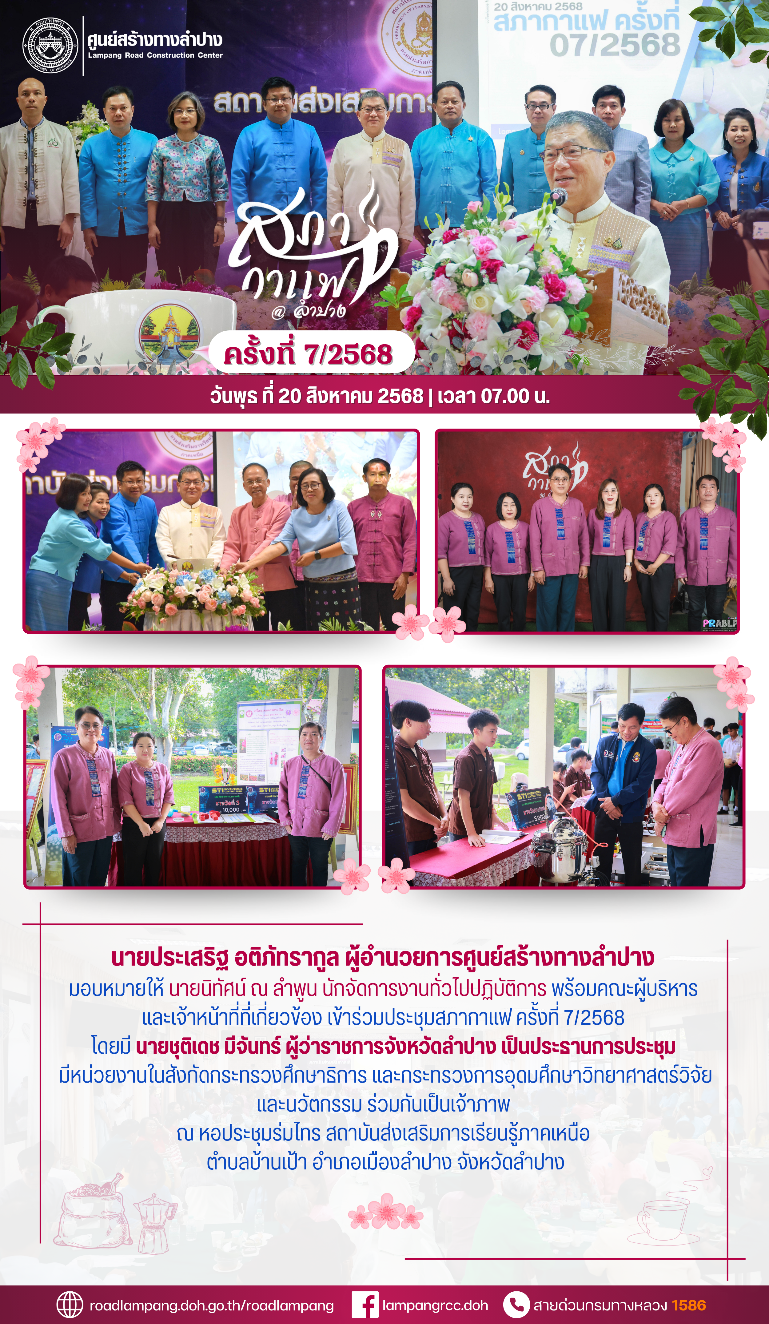 นายประเสริฐ อติภัทรากูล ผู้อำนวยการศูนย์สร้างทางลำปาง มอบหมายให้ นายนิทัศน์ ณ ลำพูน นักจัดการงานทั่วไปปฏิบัติการ พร้อมคณะผู้บริหาร และเจ้าหน้าที่ที่เกี่ยวข้อง เข้าร่วมประชุมสภากาแฟ ครั้งที่ 7/2568 โดยมี นายชุติเดช มีจันทร์ ผู้ว่าราชการจังหวัดลำปาง เป็นประธานการประชุม มีหน่วยงานในสังกัดกระทรวงศึกษาธิการ และกระทรวงการอุดมศึกษาวิทยาศาสตร์วิจัยและนวัตกรรม ร่วมกันเป็นเจ้าภาพ ณ หอประชุมร่มไทร สถาบันส่งเสริมการเรียนรู้ภาคเหนือ ตำบลบ้านเป้า อำเภอเมืองลำปาง จังหวัดลำปาง