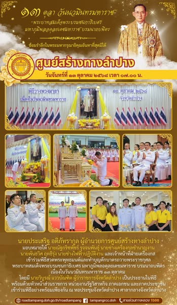 นายประเสริฐ อติภัทรากูล ผู้อำนวยการศูนย์สร้างทางลำปางมอบหมายให้ นายณัฐกริชพัชร์ รุจจนพันธุ์ นายช่างเครื่องกลชำนาญงาน นายพันธวิศ ฤทธิรุ่ง นายช่างไฟฟ้าปฏิบัติงาน และเจ้าหน้าที่ฝ่ายเครื่องกล เข้าร่วมพิธีสวดพระพุทธมนต์และทำบุญตักบาตรถวายพระราชกุศล พระบาทสมเด็จพระบรมชนกาธิเบศร มหาภูมิพลอดุลยเดชมหาราช บรมนาถบพิตร เนื่องในวันนวมินทรมหาราช ๑๓ ตุลาคม โดยมี นายวิบูรณ์ แววบัณฑิต ผู้ว่าราชการจังหวัดลำปาง เป็นประธานในพิธี พร้อมด้วยหัวหน้าส่วนราชการ หน่วยงานรัฐวิสาหกิจ ภาคเอกชน และภาคประชาชน เข้าร่วมพิธีอย่างพร้อมเพียงกัน ณ หอประชุมจังหวัดลำปาง ศาลากลางจังหวัดลำปาง