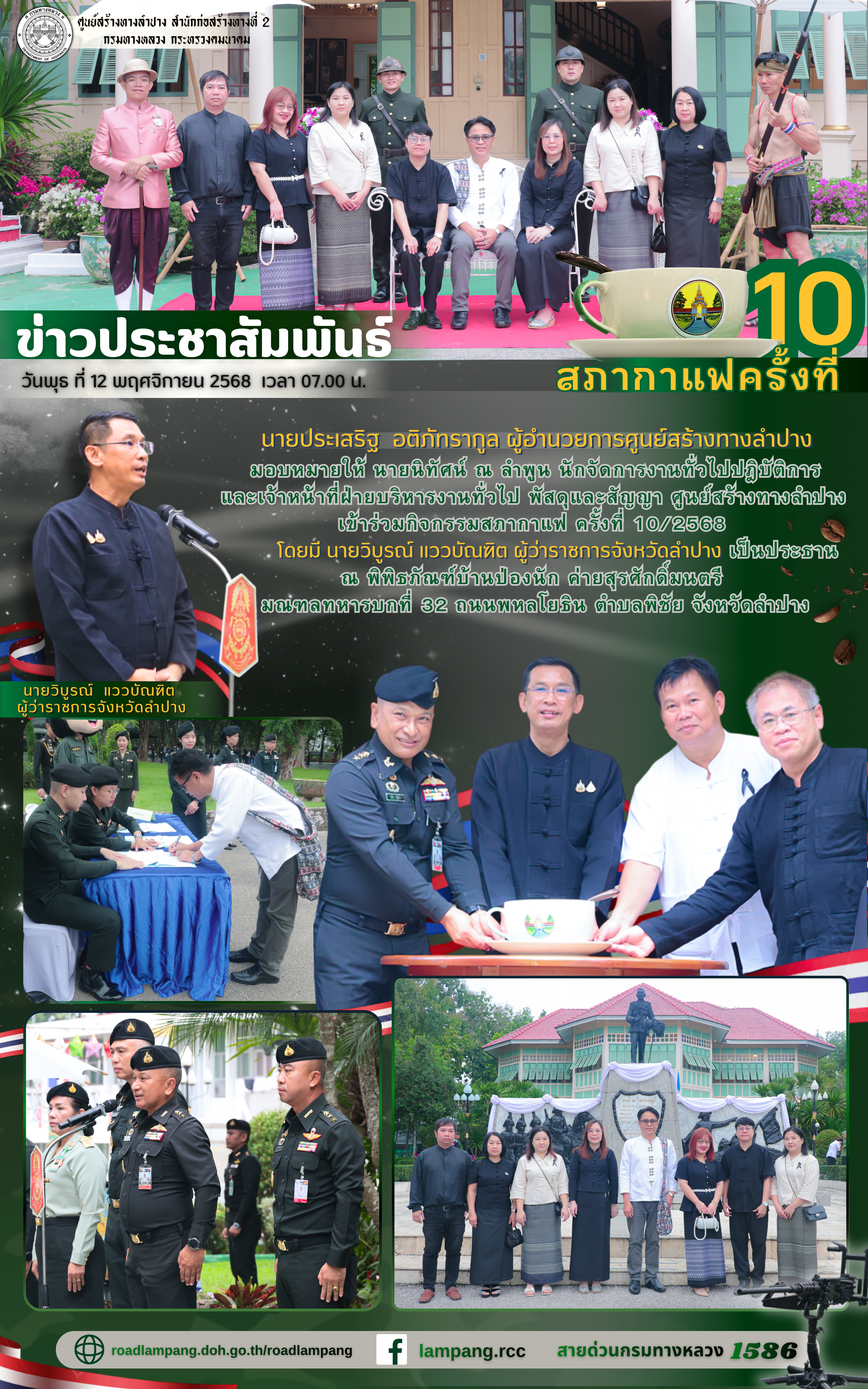นายประเสริฐ อติภัทรากูล ผู้อำนวยการศูนย์สร้างทางลำปาง มอบหมายให้ นายนิทัศน์ ณ ลำพูน นักจัดการงานทั่วไปปฎิบัติการ และเจ้าหน้าที่ฝ่ายบริหารงานทั่วไป พัสดุและสัญญา ศูนย์สร้างทางลำปาง เข้าร่วมกิจกรรมสภากาแฟ ครั้งที่ 10/2568 โดยมี นายวิบูรณ์ แววบัณฑิต ผู้ว่าราชการจังหวัดลำปาง เป็นประธาน ณ พิพิธภัณฑ์บ้านป่องนัก ค่ายสุรศักดิ์มนตรี มณฑลทหารบกที่ 32 ถนนพหลโยธิน ตำบลพิชัย จังหวัดลำปาง