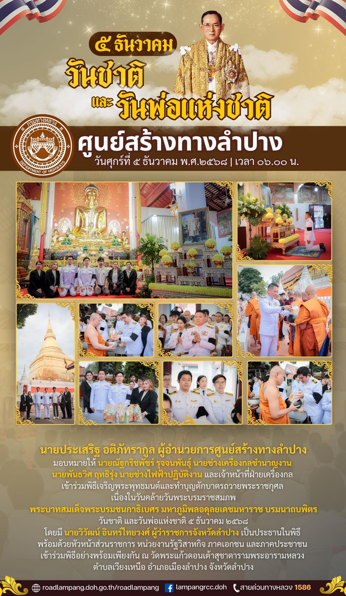 นายประเสริฐ อติภัทรากูล ผู้อำนวยการศูนย์สร้างทางลำปาง มอบหมายให้ นายณัฐกริชพัชร์ รุจจนพันธุ์ นายช่างเครื่องกลชำนาญงาน นายพันธวิศ ฤทธิรุ่ง นายช่างไฟฟ้าปฏิบัติงาน และเจ้าหน้าที่ฝ่ายเครื่องกล เข้าร่วมพิธีเจริญพระพุทธมนต์และทำบุญตักบาตรถวายพระราชกุศล เนื่องในวันคล้ายวันพระบรมราชสมภพพระบาทสมเด็จพระบรมชนกาธิเบศร มหาภูมิพลอดุลยเดชมหาราช บรมนาถบพิตรวันชาติ และวันพ่อแห่งชาติ ๕ ธันวาคม ๒๕๖๘ โดยมี นายวิวัฒน์ อินทร์ไทยวงศ์ ผู้ว่าราชการจังหวัดลำปาง เป็นประธานในพิธี พร้อมด้วยหัวหน้าส่วนราชการ หน่วยงานรัฐวิสาหกิจ ภาคเอกชน และภาคประชาชน เข้าร่วมพิธีอย่างพร้อมเพียงกัน ณ วัดพระแก้วดอนเต้าสุชาดารามพระอารามหลวง ตำบลเวียงเหนือ อำเภอเมืองลำปาง จังหวัดลำปาง