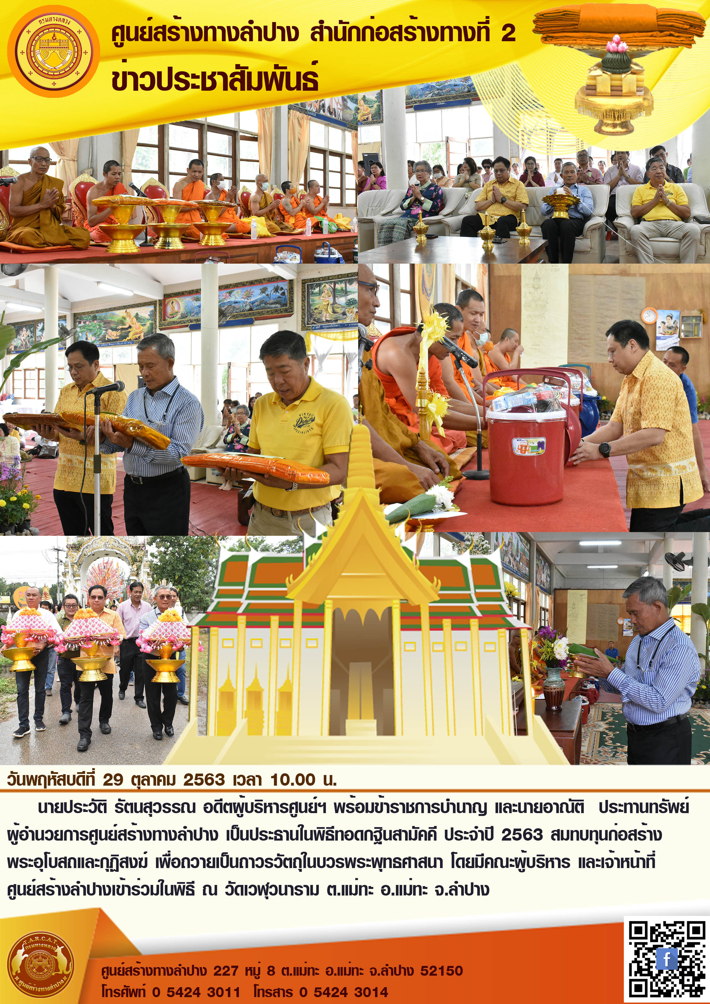 วันพฤหัสบดีที่ 29 ตุลาคม 2563 เวลา 10.00 น. นายประวัติ รัตนสุวรรณ อดีตผู้บริหารศูนย์ฯ พร้อมข้าราชการบำนาญ และนายอาณัติ ประทานทรัพย์ ผู้อำนวยการศูนย์สร้างทางลำปาง เป็นประธานในพิธีทอดกฐินสามัคคี ประจำปี 2563 สมทบทุนก่อสร้าง พระอุโบสถและกุฏิสงฆ์ เพื่อถวายเป็นถาวรวัตถุในบวรพระพุทธศาสนา โดยมีคณะผู้บริหาร และเจ้าหน้าที่ ศูนย์สร้างลำปางเข้าร่วมในพิธี ณ วัดเวฬุวนาราม ต.แม่ทะ อ.แม่ทะ จ.ลำปาง
