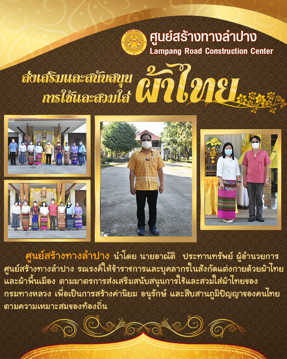 ศูนย์สร้างทางลำปาง นำโดย นายอาณัติ ประทานทรัพย์ ผู้อำนวยการ ศูนย์สร้างทางลำปาง รณรงค์ให้ข้าราชการและบุคลากรในสังกัดแต่งกายด้วยผ้าไทยและผ้าพื้นเมือง ตามมาตรการส่งเสริมสนับสนุนการใช้และสวมใส่ผ้าไทยของกรมทางหลวง เพื่อเป็นการสร้างค่านิยม อนุรักษ์ และสืบสานภูมิปัญญาของคนไทย ตามความเหมาะสมของท้องถิ่น