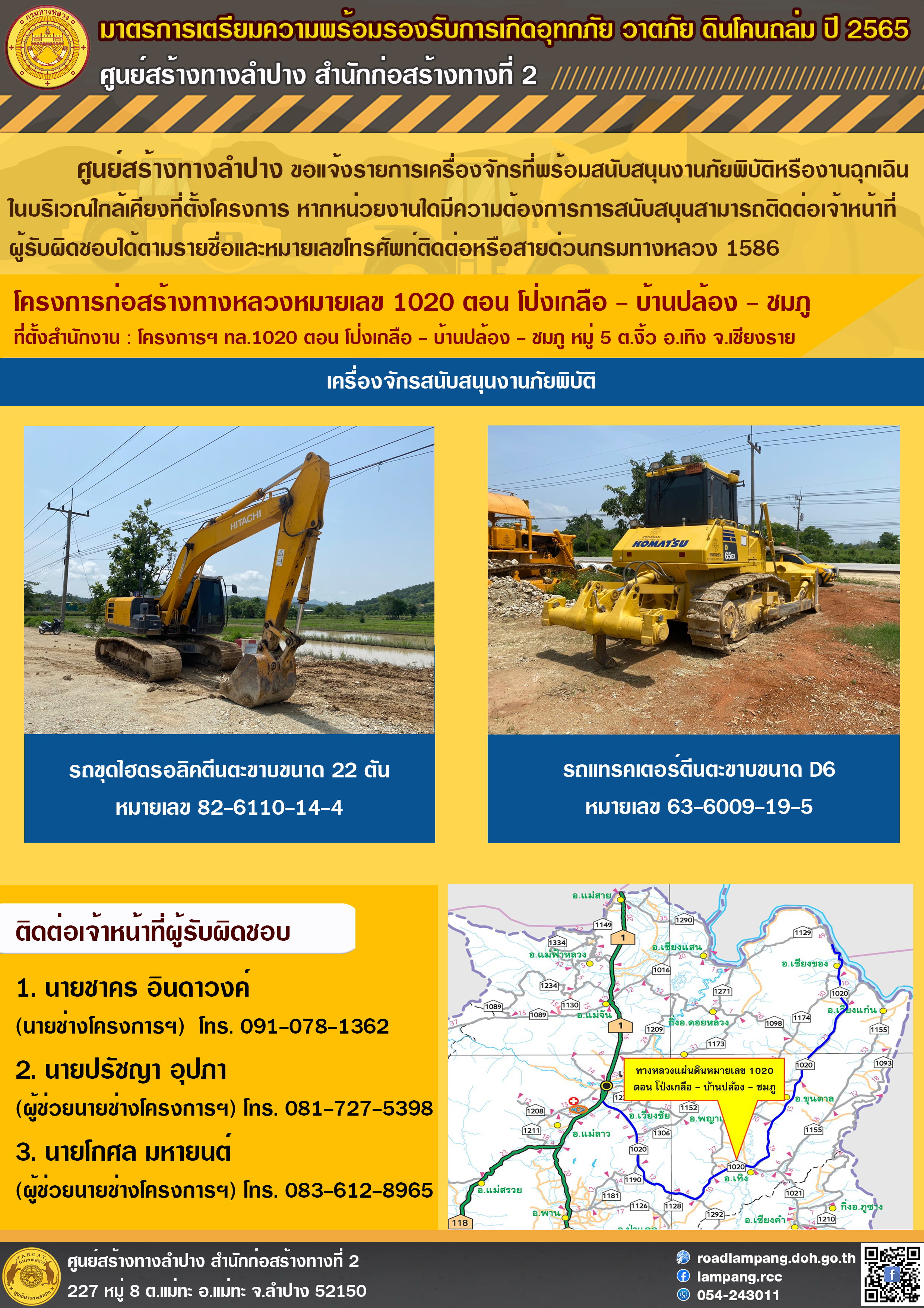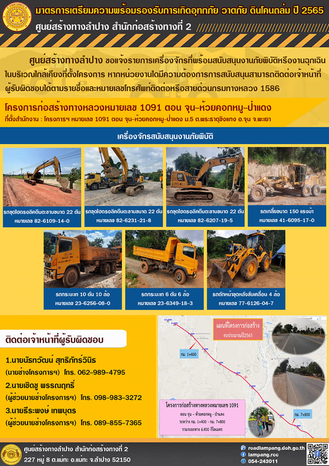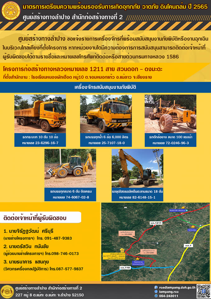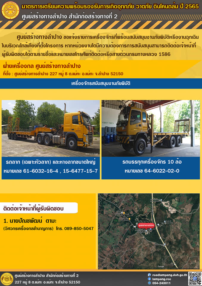 ศูนย์สร้างทางลําปาง เตรียมความพร้อมในการสนับสนุนเครื่องจักรกลพร้อมเจ้าหน้าที่ เพื่อรองรับการแก้ไขปัญหางานภัยพิบัติที่เกิดจากอุทกภัย วาตภัย และดินโคลนถล่มในพื้นที่หรือบริเวณใกล้เคียงโครงการก่อสร้างทาง ที่ส่งผลกระทบต่อระบบคมนาคมขนส่งและการสัญจรของประชาชน หากหน่วยงานใดมีความต้องการขอรับการสนับสนุน สามารถติดต่อเจ้าหน้าที่ผู้รับผิดชอบได้ตามรายชื่อและหมายเลขโทรศัพท์ติดต่อ หรือสายด่วนกรมทางหลวง 1586