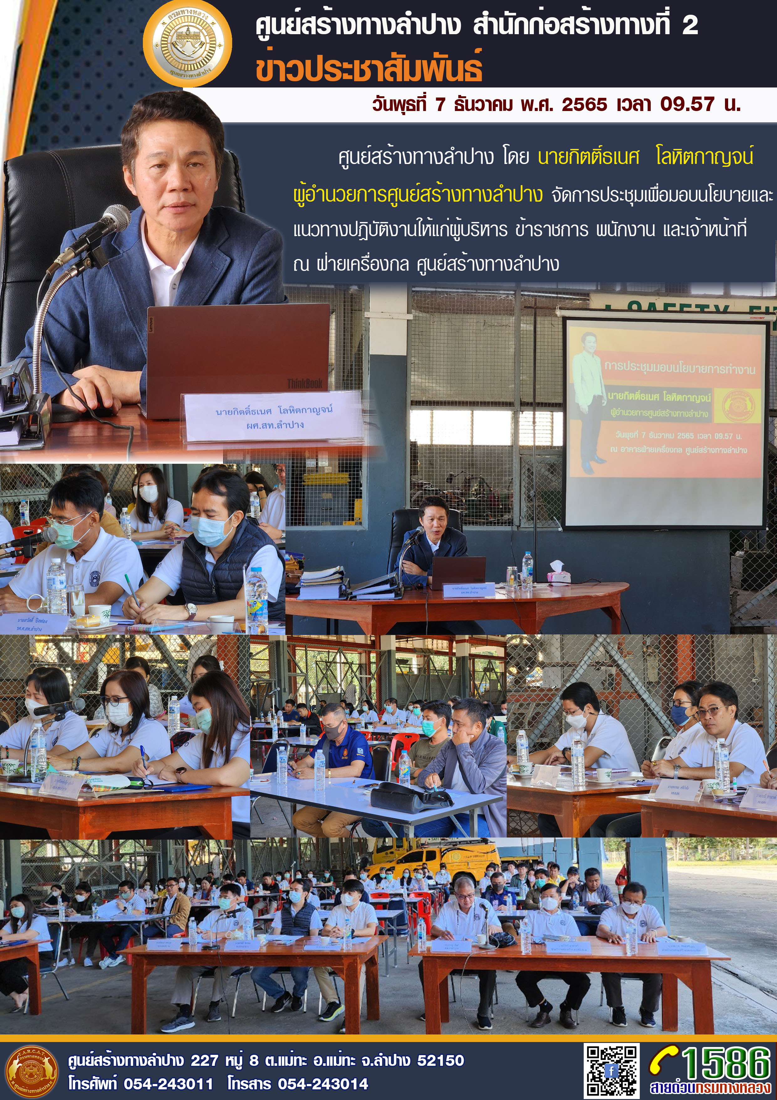 ศูนย์สร้างทางลำปาง โดยนายกิตติ์ธเนศ โลหิตกาญจน์ ผู้อำนวยการศูนย์สร้างทางลำปาง จัดการประชุมเพื่อมอบนโยบายและแนวทางปฏิบัติงานให้แก่คณะผู้บริหาร ข้าราชการ พนักงาน และเจ้าหน้าที่ ณ ฝ่ายเครื่องกล ศูนย์สร้างทางลำปาง
