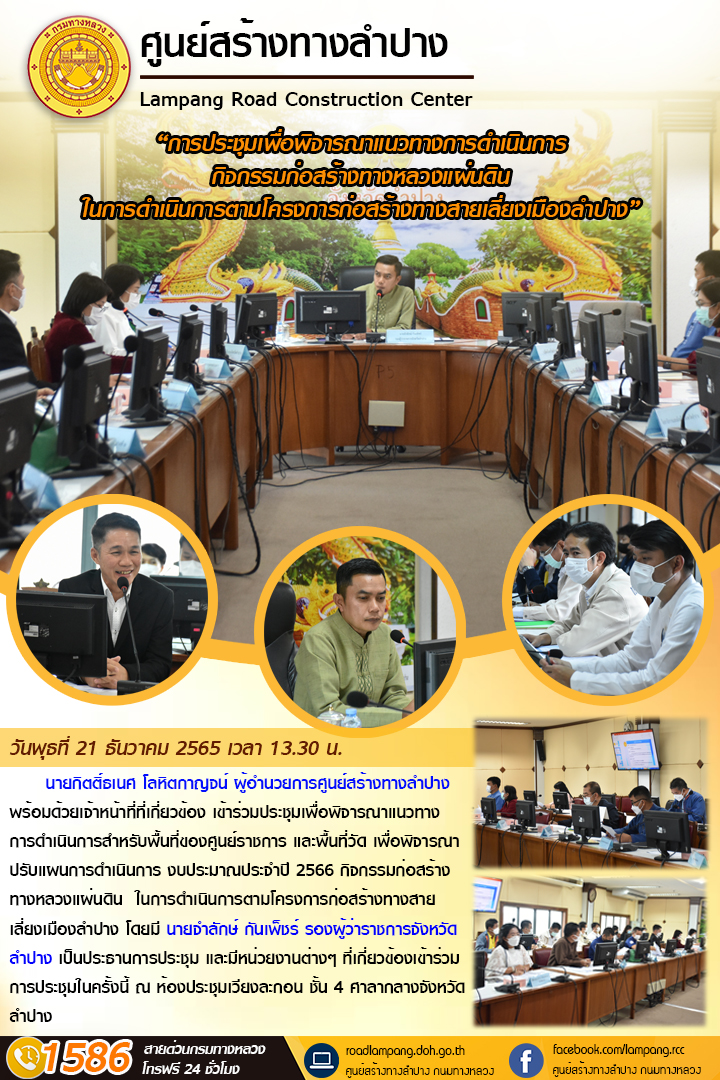 นายกิตติ์ธเนศ โลหิตกาญจน์ ผู้อำนวยการศูนย์สร้างทางลำปาง พร้อมด้วยเจ้าหน้าที่ที่เกี่ยวข้อง เข้าร่วมประชุมเพื่อพิจารณาแนวทางการดำเนินการสำหรับพื้นที่ของศูนย์ราชการ และพื้นที่วัด เพื่อพิจารณาปรับแผนการดำเนินการ งบประมาณประจำปี 2566 กิจกรรมก่อสร้างทางหลวงแผ่นดิน ในการดำเนินการตามโครงการก่อสร้างทางสายเลี่ยงเมืองลำปาง