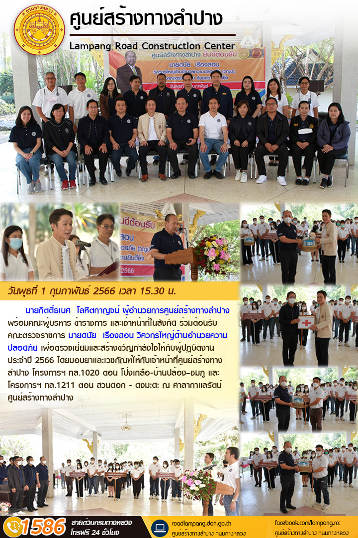นายกิตติ์ธเนศ โลหิตกาญจน์ ผู้อำนวยการศูนย์สร้างทางลำปาง พร้อมคณะผู้บริหาร ข้าราชการ และเจ้าหน้าที่ในสังกัด ร่วมต้อนรับคณะตรวจราชการ นายดนัย เรืองสอน วิศวกรใหญ่ด้านอำนวยความปลอดภัย เพื่อตรวจเยี่ยมและสร้างขวัญกำลังใจให้กับผู้ปฏิบัติงาน ประจำปี 2566 โดยมอบยาและเวชภัณฑ์ให้กับเจ้าหน้าที่ศูนย์สร้างทางลำปาง โครงการฯ ทล.1020 ตอน โป่งเกลือ - บ้านปล้อง – ชมภู และ โครงการฯ ทล.1211 ตอน สวนดอก - ดงมะดะ ณ ศาลากาแลรัตน์ ศูนย์สร้างทางลำปาง