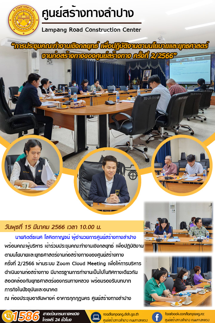 นายกิตติ์ธเนศ โลหิตกาญจน์ ผู้อำนวยการศูนย์สร้างทางลำปาง พร้อมคณะผู้บริหาร เข้าร่วมประชุมคณะทำงานเชิงกลยุทธ์ เพื่อปฏิบัติงานตามนโยบายและยุทธศาสตร์งานก่อสร้างทางของศูนย์สร้างทาง ครั้งที่ 2/2566 ผ่านระบบ Zoom Cloud Meeting เพื่อให้การบริหารดำเนินงานก่อสร้างทาง มีมาตรฐานการทำงานเป็นไปในทิศทางเดียวกันสอดคล้องกับยุทธศาสตร์ของกรมทางหลวง พร้อมรองรับบทบาทภารกิจในปัจจุบันและอนาคต ณ ห้องประชุมอาลัมพางค์ อาคารกุกกุฎนคร ศูนย์สร้างทางลำปาง