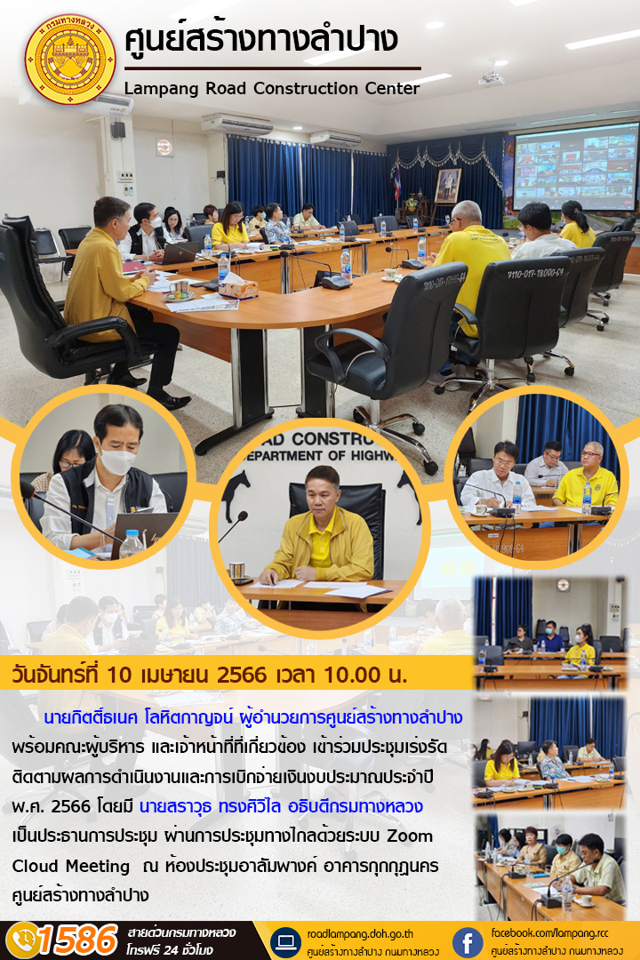 นายกิตติ์ธเนศ โลหิตกาญจน์ ผู้อำนวยการศูนย์สร้างทางลำปาง พร้อมคณะผู้บริหาร และเจ้าหน้าที่ที่เกี่ยวข้อง เข้าร่วมประชุมเร่งรัดติดตามผลการดำเนินงานและการเบิกจ่ายเงินงบประมาณประจำปี พ.ศ. 2566 โดยมี นายสราวุธ ทรงศิวิไล อธิบดีกรมทางหลวง เป็นประธานการประชุม ผ่านการประชุมทางไกลด้วยระบบ Zoom Cloud Meeting ณ ห้องประชุมอาลัมพางค์ อาคารกุกกุฎนคร ศูนย์สร้างทางลำปาง
