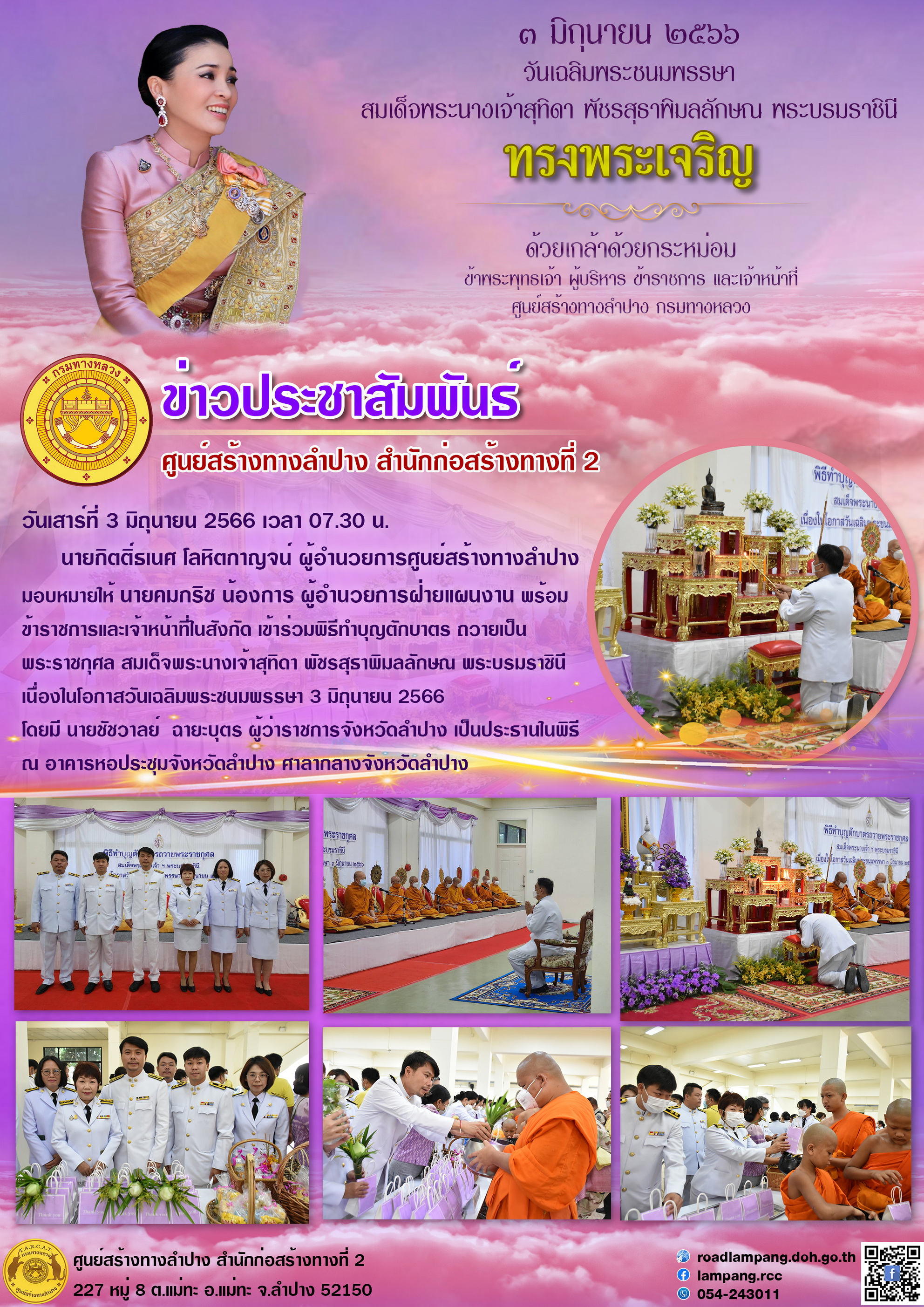 นายกิตติ์ธเนศ โลหิตกาญจน์ ผู้อำนวยการศูนย์สร้างทางลำปาง มอบหมายให้ นายคมกริช น้องการ ผู้อำนวยการฝ่ายแผนงาน พร้อมข้าราชการและเจ้าหน้าที่ในสังกัด เข้าร่วมพิธีทำบุญตักบาตร ถวายเป็นพระราชกุศล สมเด็จพระนางเจ้าสุทิดา พัชรสุธาพิมลลักษณ พระบรมราชินี เนื่องในโอกาสวันเฉลิมพระชนมพรรษา 3 มิถุนายน 2566 โดยมี นายชัชวาลย์ ฉายะบุตร ผู้ว่าราชการจังหวัดลำปาง เป็นประธานในพิธี ณ อาคารหอประชุมจังหวัดลำปาง ศาลากลางจังหวัดลำปาง