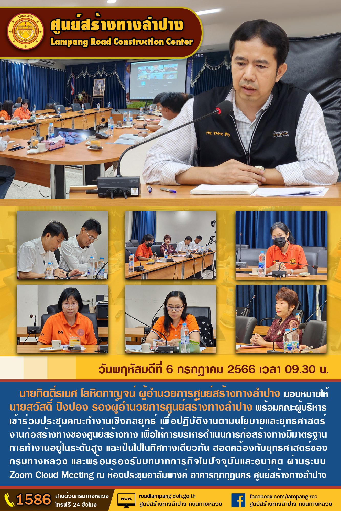 นายกิตติ์ธเนศ โลหิตกาญจน์ ผู้อำนวยการศูนย์สร้างทางลำปาง มอบหมายให้ นายสวัสดิ์ ปิงฟอง รองผู้อำนวยการศูนย์สร้างทางลำปาง พร้อมคณะผู้บริหาร เข้าร่วมประชุมคณะทำงานเชิงกลยุทธ์ เพื่อปฎิบัติงานตามนโยบายและยุทธศาสตร์ งานก่อสร้างทางของศูนย์สร้างทาง เพื่อให้การบริหารดำเนินการก่อสร้างทางมีมาตรฐานการทำงานอยู่ในระดับสูง และเป็นไปในทิศทางเดียวกัน สอดคล้องกับยุทธศาสตร์ของกรมทางหลวง และพร้อมรองรับบทบาทภารกิจในปัจจุบันและอนาคต ผ่านระบบ Zoom Cloud Meeting ณ ห้องประชุมอาลัมพางค์ อาคารกุกกุฎนคร ศูนย์สร้างทางลำปาง